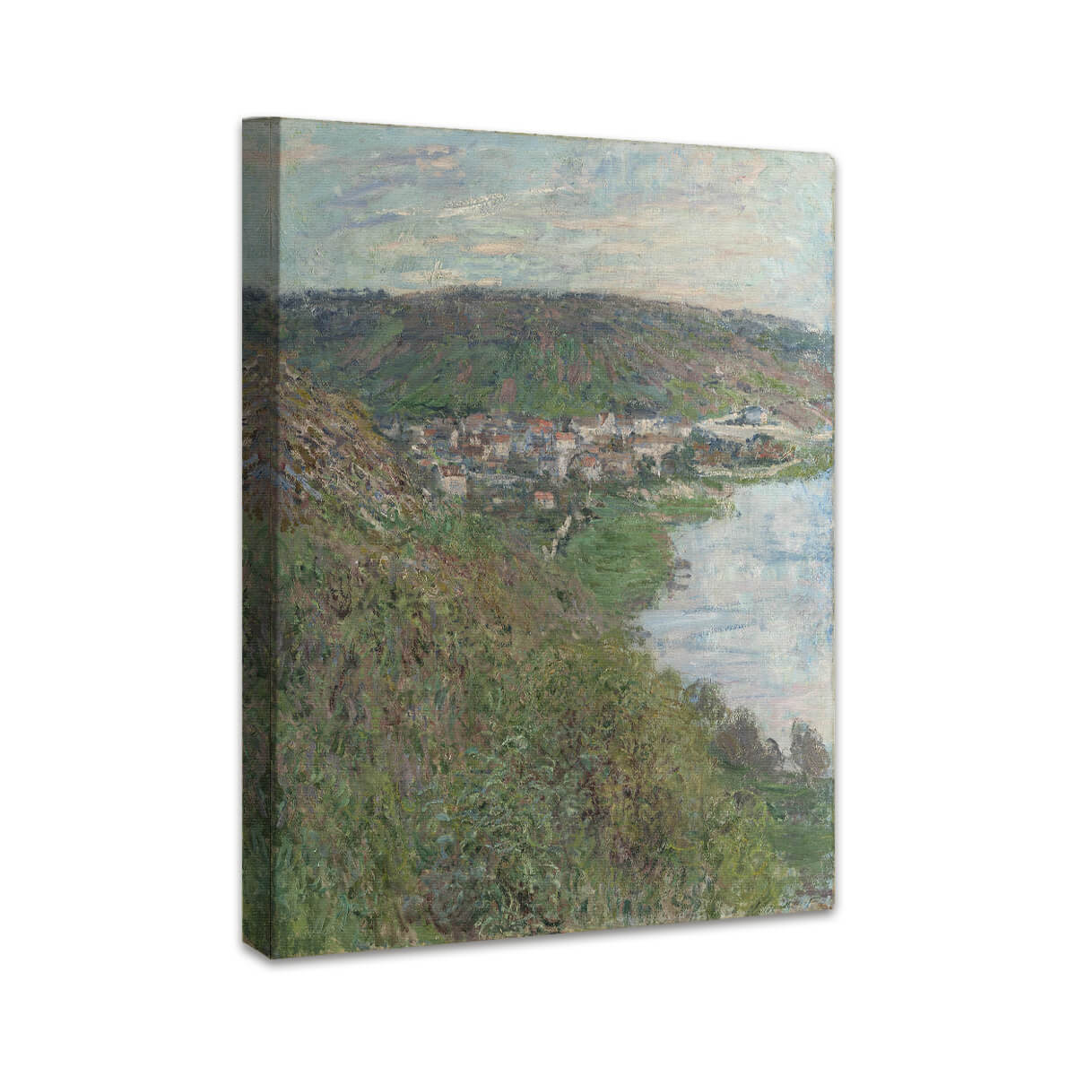 Tauchen Sie ein in die Welt des Impressionismus mit Claude Monets faszinierendem Werk "Ansicht von Vétheuil". Dieses Gemälde zeigt eine malerische Landschaft mit der kleinen französischen Ortschaft Vétheuil, eingefangen in leuchtenden Farben und atmosphärischem Licht. Mit seinen kurzen, lebendigen Pinselstrichen und einer meisterhaften Darstellung von Reflexionen und Helligkeit schafft Monet eine friedvolle und zugleich dynamische Szenerie.