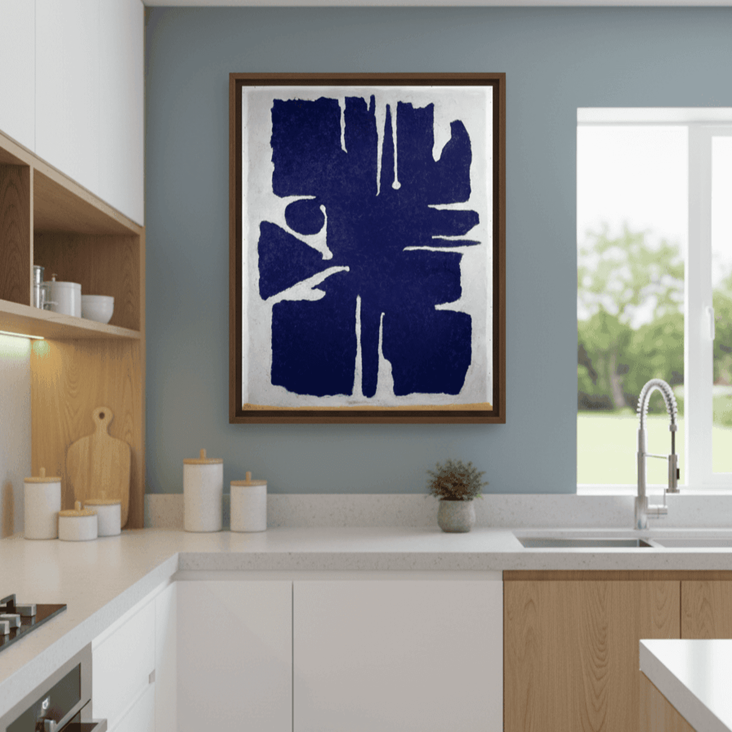 Willi Baumeisters "Aru dunkelblau" besticht durch seine reduzierte, kraftvolle Formensprache und die dominante, tiefblaue Farbfläche. Organische Formen und feine Kontraste erzeugen eine ruhige, zugleich spannungsvolle Bildwirkung. Das Werk wirkt archaisch und modern zugleich und lädt zur kontemplativen Betrachtung ein. Diese hochwertige Kunstreproduktion bringt Tiefe, Klarheit und moderne Eleganz in Ihr Zuhause.