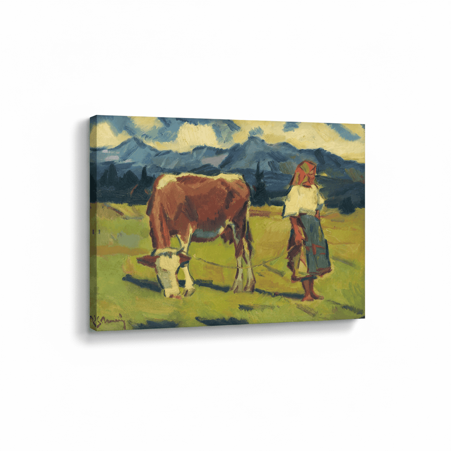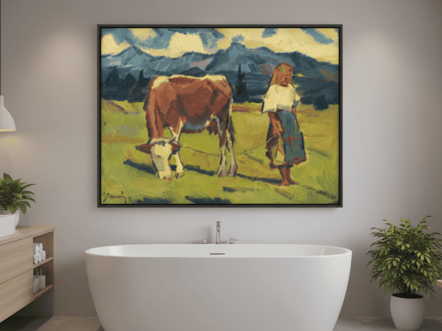 Dieser Kunstdruck zeigt das Werk "Auf der Weide" von Gustav Mally und vermittelt eine ruhige, naturnahe Szene des ländlichen Lebens. Die offene Landschaft, die weichen Formen und die harmonische Farbgebung erzeugen eine entspannte, beinahe idyllische Atmosphäre. Mally verbindet Naturdarstellung mit einer klaren, reduzierten Formensprache und verleiht dem Motiv dadurch eine zeitlose Wirkung. Die ausgewogene Komposition und die freundlichen Farbtöne lassen das Bild leicht und zugänglich erscheinen. Der hochwertige Druck gibt die Farbflächen, Linien und Strukturen detailreich wieder. Ideal für Wohnräume, Büros oder Orte, an denen Sie eine ruhige, naturverbundene und freundliche Stimmung schaffen möchten.
