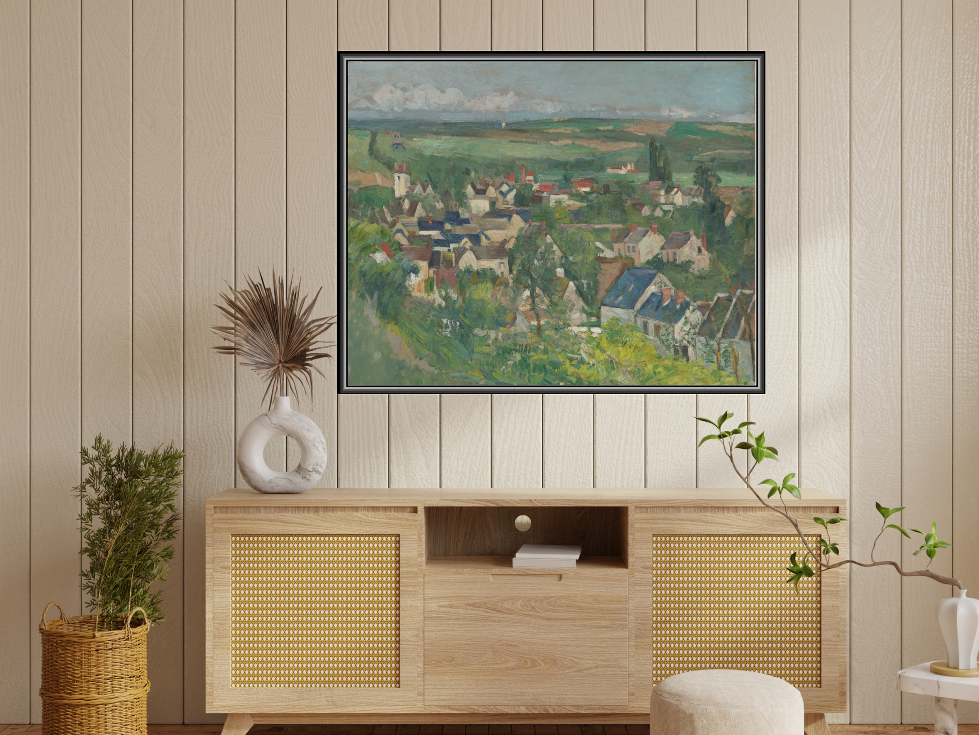 "Auvers, Panoramablick“ ist ein beeindruckendes Landschaftsgemälde des französischen Malers Paul Cézanne, das eine weite Aussicht auf das Dorf Auvers-sur-Oise in der Nähe von Paris darstellt. In diesem Werk kombiniert Cézanne seine charakteristische Technik des Pinselstrichs mit einer einzigartigen Perspektive, um die Natur sowohl in ihrer Detailtreue als auch in ihrer Gesamtwirkung einzufangen.