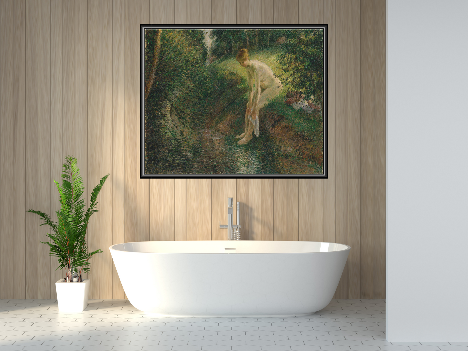 Tauchen Sie ein in die Natur mit einem Kunstdruck von Camille Pissarros "Badender im Wald“. Das impressionistische Meisterwerk zeigt eine Frau, die in einem idyllischen Waldstück badet, umgeben von der Ruhe der Natur. Pissarro fängt meisterhaft das sanfte Licht und die lebendigen Grüntöne des Waldes ein und schafft eine intime, fast meditative Atmosphäre. Die Kombination aus feinster Detailgenauigkeit und dynamischen Pinselstrichen bringt die natürliche Schönheit und das harmonische Zusammenspiel von Mensch und Natur zum Leben. Ein beeindruckendes Kunstwerk, das in jedem Raum ein Gefühl von Ruhe und Frieden verbreitet. Ideal für Liebhaber klassischer Kunst und Impressionismus, sowie für diejenigen, die ihrem Zuhause eine beruhigende, grüne Note verleihen möchten.