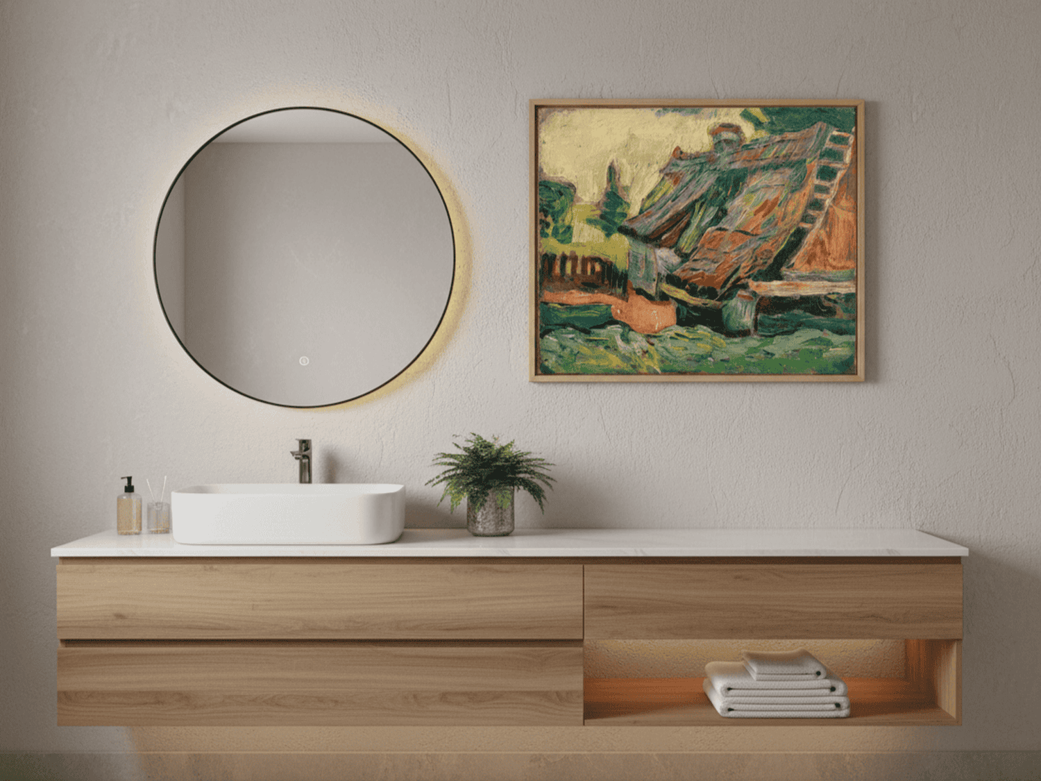Unsere Schattenfugenrahmen werden passgenau um das auf Keilrahmen gespannte Gemälde montiert. Der umlaufende Abstand von etwa 1 cm erzeugt eine elegante Schattenfuge, die dem Kunstwerk zusätzliche optische Tiefe verleiht.