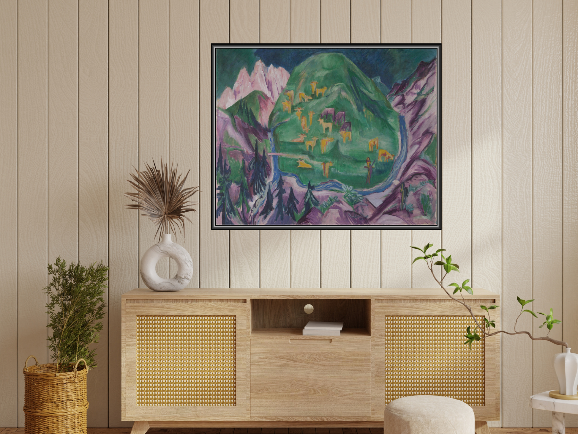 Mit dem Gemälde "Berg mit Vie"h von Ernst Ludwig Kirchner holen Sie sich ein beeindruckendes Stück alpiner Idylle in Ihr Zuhause. Das Werk, entstanden im Jahr 1918, zeigt eine friedliche Berglandschaft mit grasenden Tieren, eingebettet in die majestätische Kulisse der Schweizer Alpen – ein Motiv, das Kirchners Faszination für die Natur und das einfache Leben widerspiegelt.