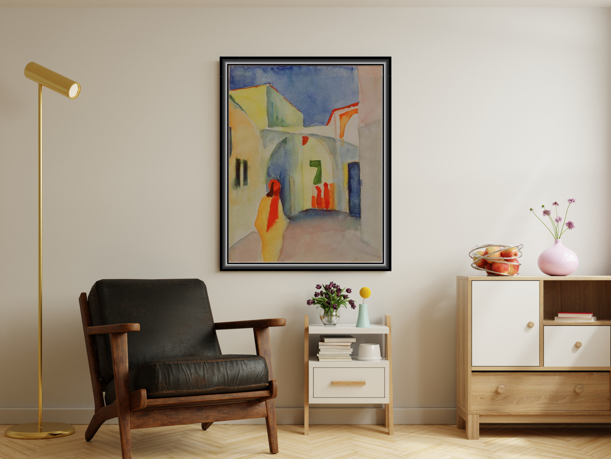 Das Kunstwerk "Blick in Gasse in Tunis" von August Macke ist ein exquisites Beispiel für den deutschen Expressionismus. Macke ist bekannt für seine Fähigkeit, Alltagsszenen in lebendige und farbenfrohe Meisterwerke zu verwandeln. In diesem Gemälde stellt er eine belebte Gasse dar, die von farbenfrohen Gebäuden mit roten und blauen Akzenten gesäumt wird.