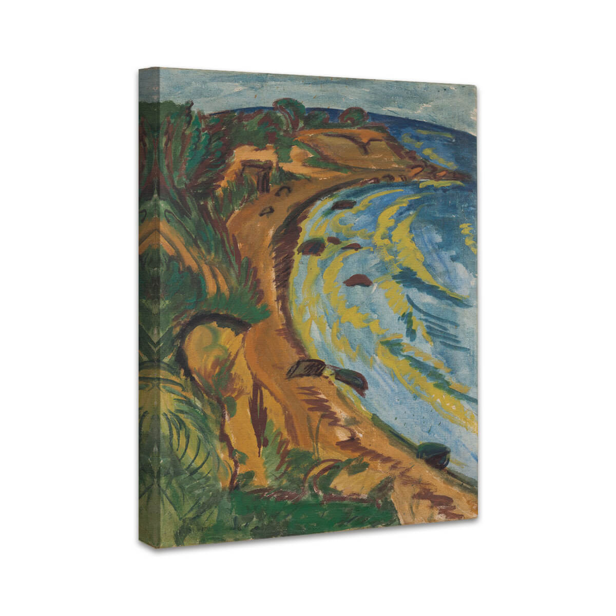 Kirchner, einer der bedeutendsten Vertreter des deutschen Expressionismus, verbrachte mehrere Sommer auf Fehmarn und hielt die raue, unberührte Natur mit dynamischen Pinselstrichen und intensiven Farben fest. Die geschwungenen Formen der Küstenlinie, das leuchtende Blau des Meeres und die kontrastreichen Grüntöne der Vegetation verleihen dem Gemälde eine kraftvolle, fast pulsierende Energie. Hier zeigt sich Kirchners einzigartiger Stil – eine Mischung aus Bewegung, Emotion und subjektiver Wahrnehmung der Natur.