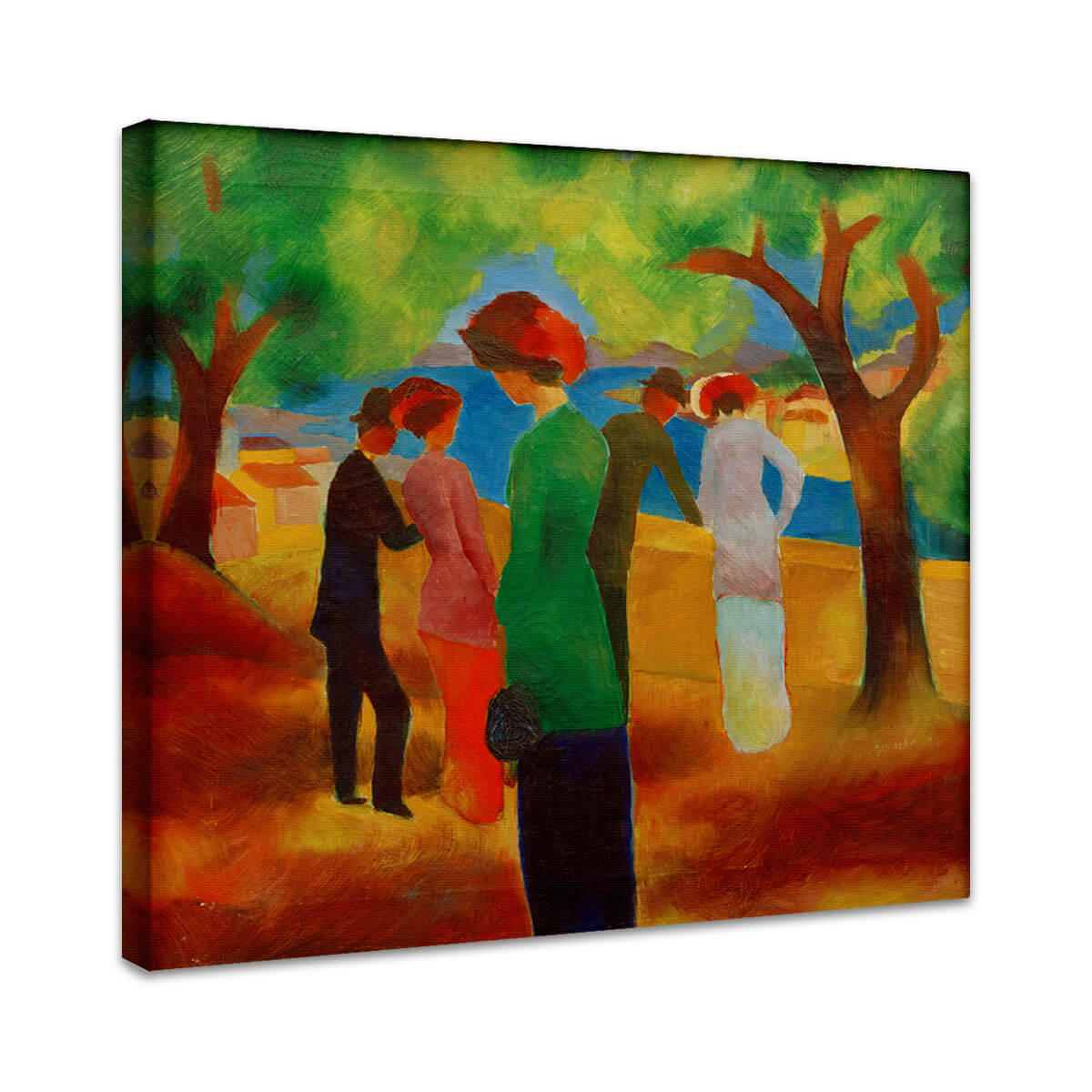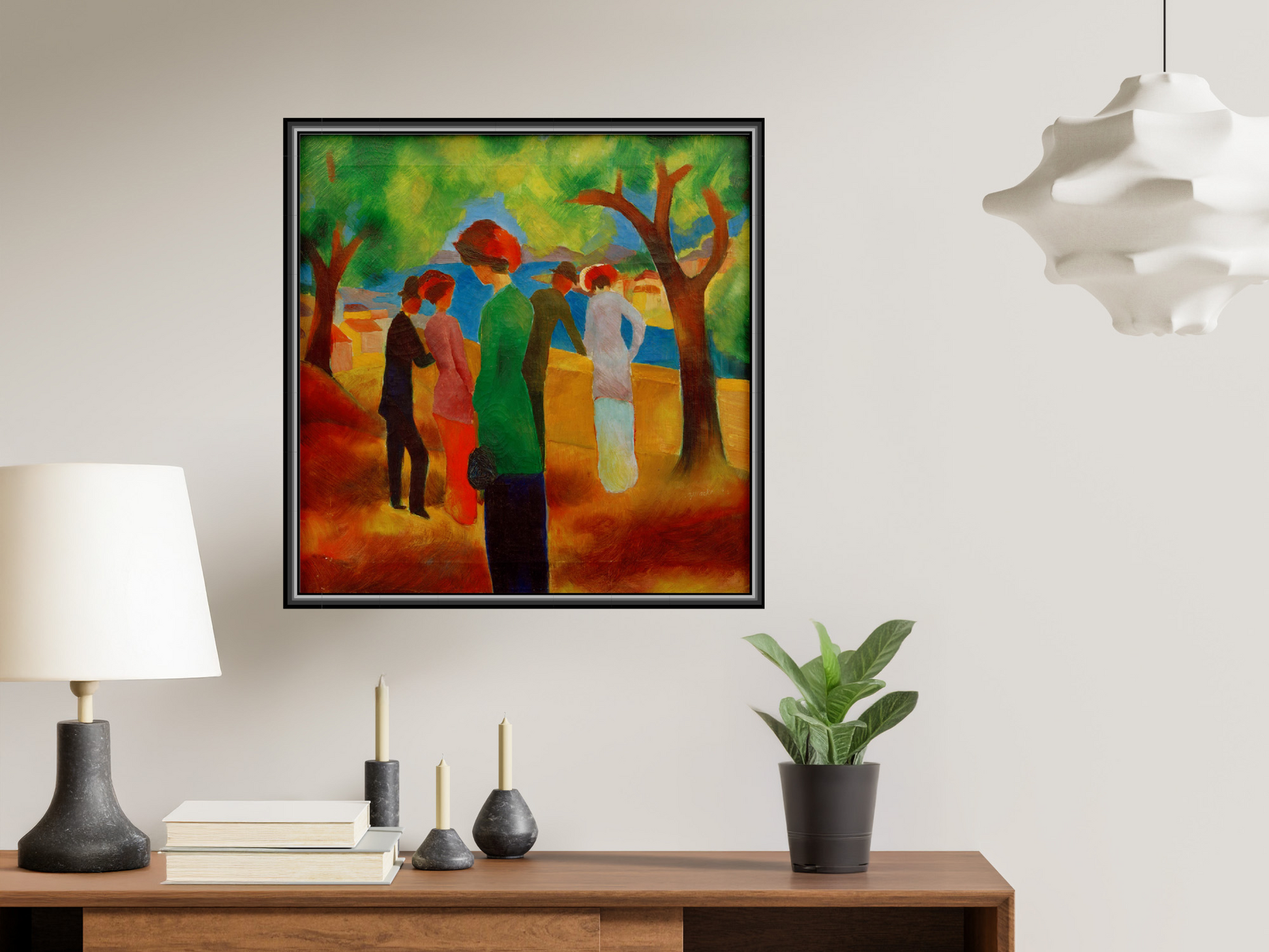 August Mackes "Dame in grüner Jacke" besticht durch seine lebendige Farbigkeit und klare Komposition. Die elegante Frau in stilisierter Form steht im Mittelpunkt eines impressionistisch anmutenden Parks. Mit seiner typischen Leuchtkraft und harmonischen Flächenaufteilung verleiht das Gemälde jedem Raum eine zeitlose Frische. Diese hochwertige Kunstreproduktion bringt Mackes modernen Blick auf die Welt stilvoll in Ihr Zuhause.