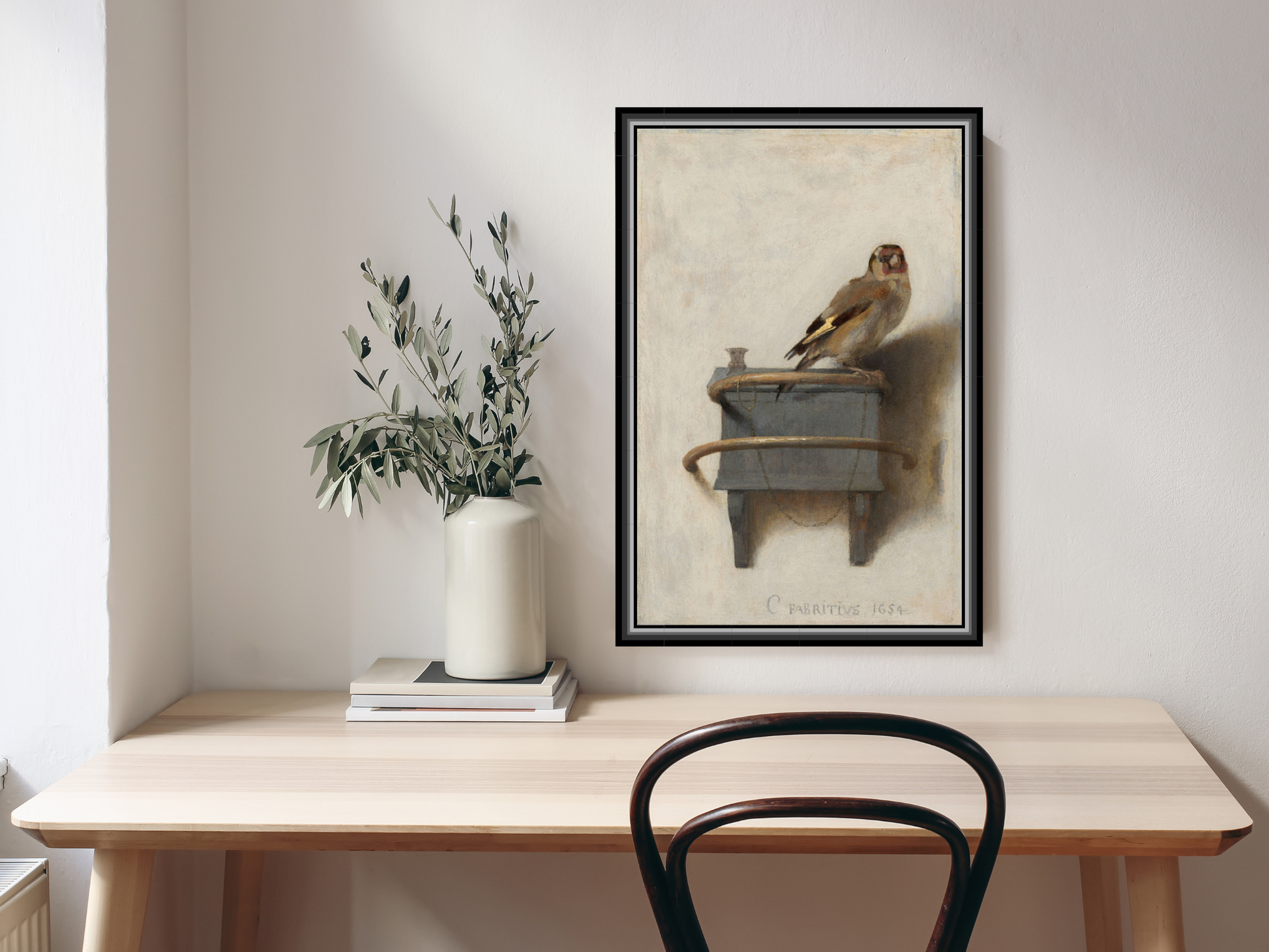 Carel Fabritius’ "Der Distelfink" ist ein Meisterwerk der niederländischen Malerei des 17. Jahrhunderts. In zarter Farbgebung und mit eindrucksvollem Lichtspiel zeigt das kleine Gemälde einen an einer Kette befestigten Distelfink – lebendig, realistisch und zugleich symbolträchtig. Unsere hochwertige Kunstreproduktion bringt die Feinheit und Tiefe dieses ikonischen Bildes in Ihr Zuhause – ideal für Liebhaber barocker Stilllebenkunst.