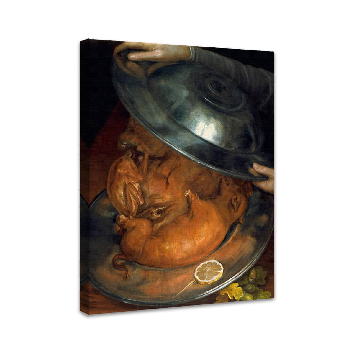 Verleihen Sie Ihrem Zuhause eine originelle künstlerische Note mit diesem hochwertigen Kunstdruck von Giuseppe Arcimboldos "Der Koch" (Il Cuoco). Dieses faszinierende Werk aus dem Jahr 1570 zeigt auf den ersten Blick eine Platte mit verschiedenen Fleischsorten. Dreht man das Bild jedoch um 180 Grad, offenbart sich ein menschliches Gesicht, das aus den arrangierten Fleischstücken zu bestehen scheint. Dieses Meisterwerk des Manierismus demonstriert Arcimboldos innovative Technik, alltägliche Objekte in überraschende Porträts zu verwandeln.