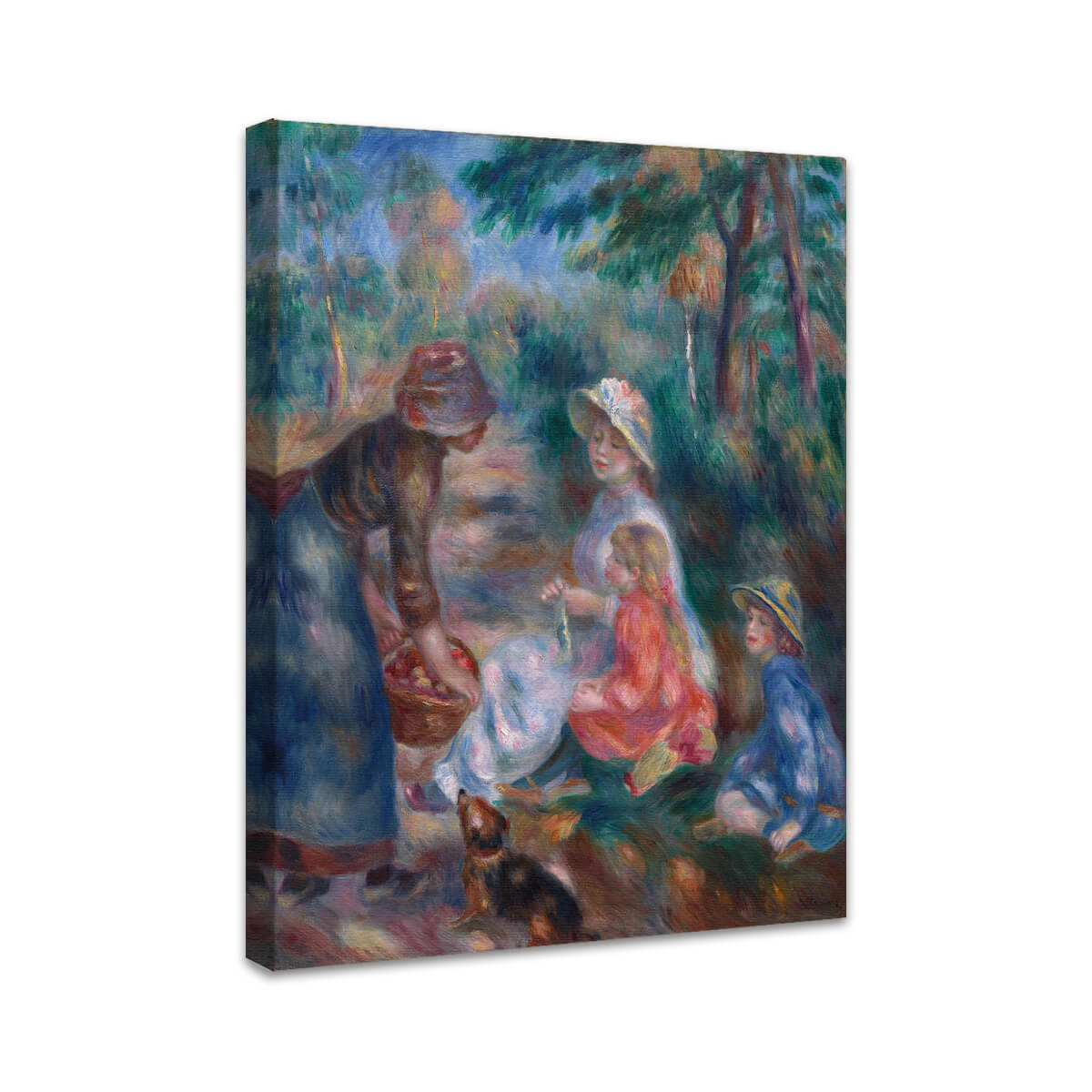 "Die Apfelverkäuferin“ von Pierre-Auguste Renoir ist ein charmantes Beispiel für den Impressionismus, das eine junge Landfrau zeigt, die Äpfel anbietet. Die Szene spielt wahrscheinlich in Essoyes, einer Stadt im Osten Frankreichs, und fängt die ländliche Atmosphäre jener Zeit ein. Die weichen, fließenden Pinselstriche und das sanfte, gefleckte Sonnenlicht verleihen dem Bild eine lebendige und einladende Stimmung. Die Darstellung der Figuren, verbunden durch die fließenden Pinselstriche, und der springende Hund, der der ansonsten ruhigen Szene einen humorvollen Akzent verleiht, unterstreichen Renoirs meisterhafte Fähigkeit, Bewegung und Leben einzufangen.