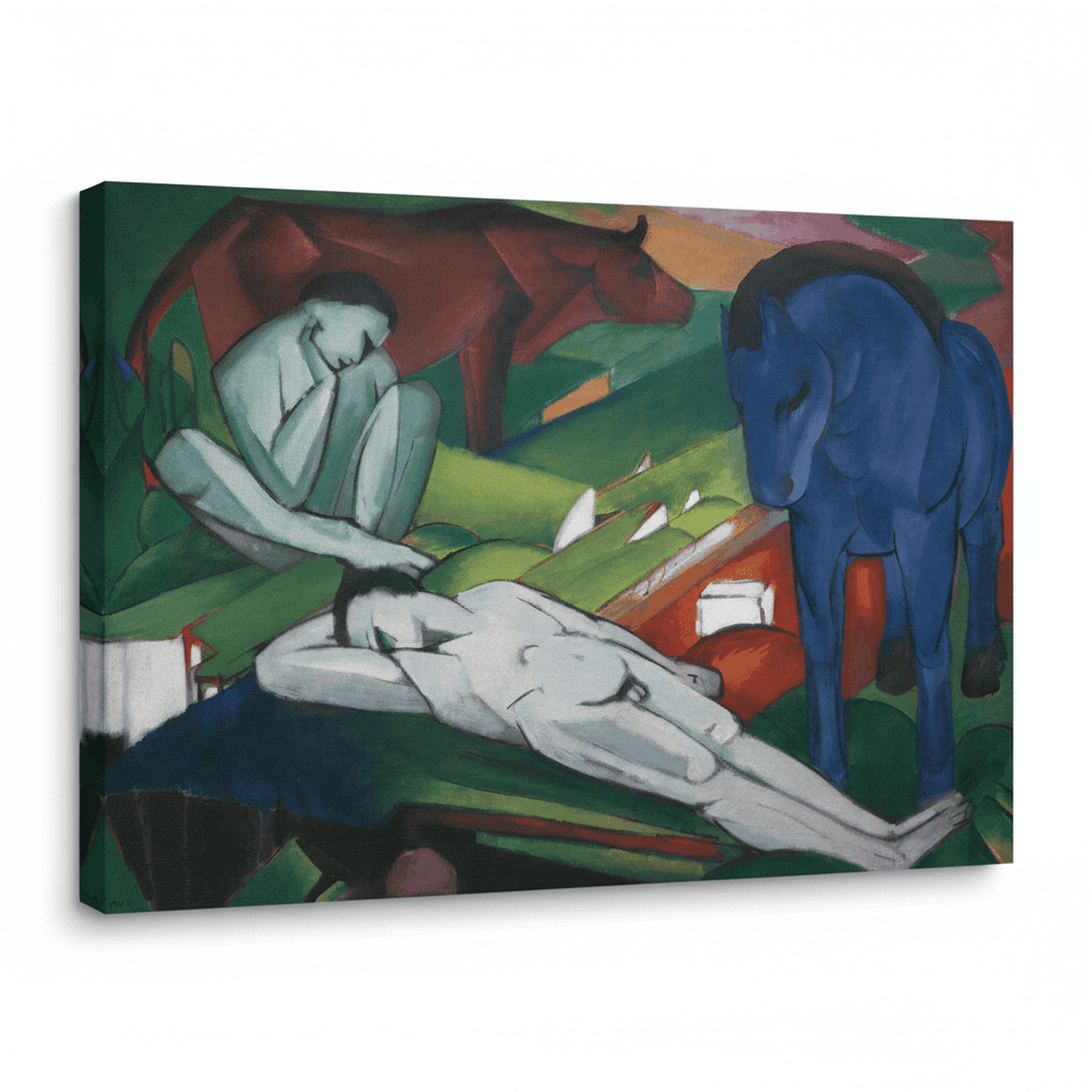 "Die Hirten" zeigt eine ausdrucksstarke Szene, in der Mensch, Tier und Landschaft in einer harmonisch vereinfachten, farbintensiven Bildsprache miteinander verschmelzen. Die charakteristische Formreduktion und die leuchtenden Farben stehen exemplarisch für Franz Marcs expressionistische Phase und seine Suche nach einer spirituell durchdrungenen Naturdarstellung. Das Werk erzeugt eine kraftvolle, zugleich ruhige Atmosphäre und gehört zu den Kompositionen, die Marcs intuitiven Umgang mit Symbolik und Farbe sichtbar machen. Als hochwertiger Kunstdruck wirkt dieses Motiv modern, klar strukturiert und besonders stimmungsvoll.