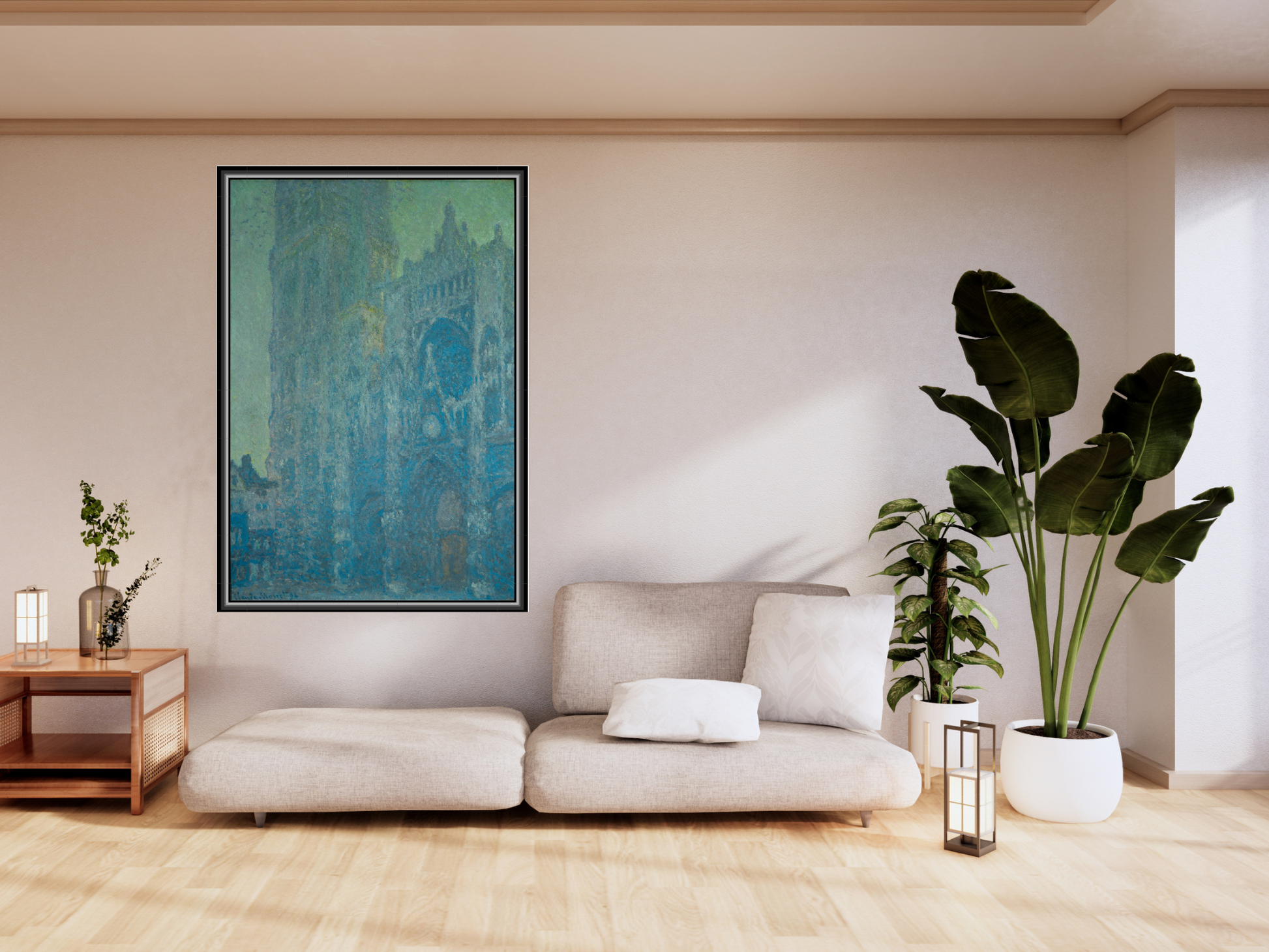 Erleben Sie die beeindruckende Lichtkunst von Claude Monets "Die Kathedrale von Rouen“ aus dem Jahr 1894, ein Höhepunkt seiner berühmten Kathedralen-Serie. Dieses Meisterwerk, das die Fassade der Kathedrale von Rouen einfängt, zeigt Monets unvergleichliche Fähigkeit, die subtile Veränderung von Licht und Atmosphäre im Verlauf des Tages darzustellen. Mit sanften Blautönen und warmen Farbakzenten vermittelt das Gemälde eine einzigartige Harmonie aus Struktur und Lichtspiel.