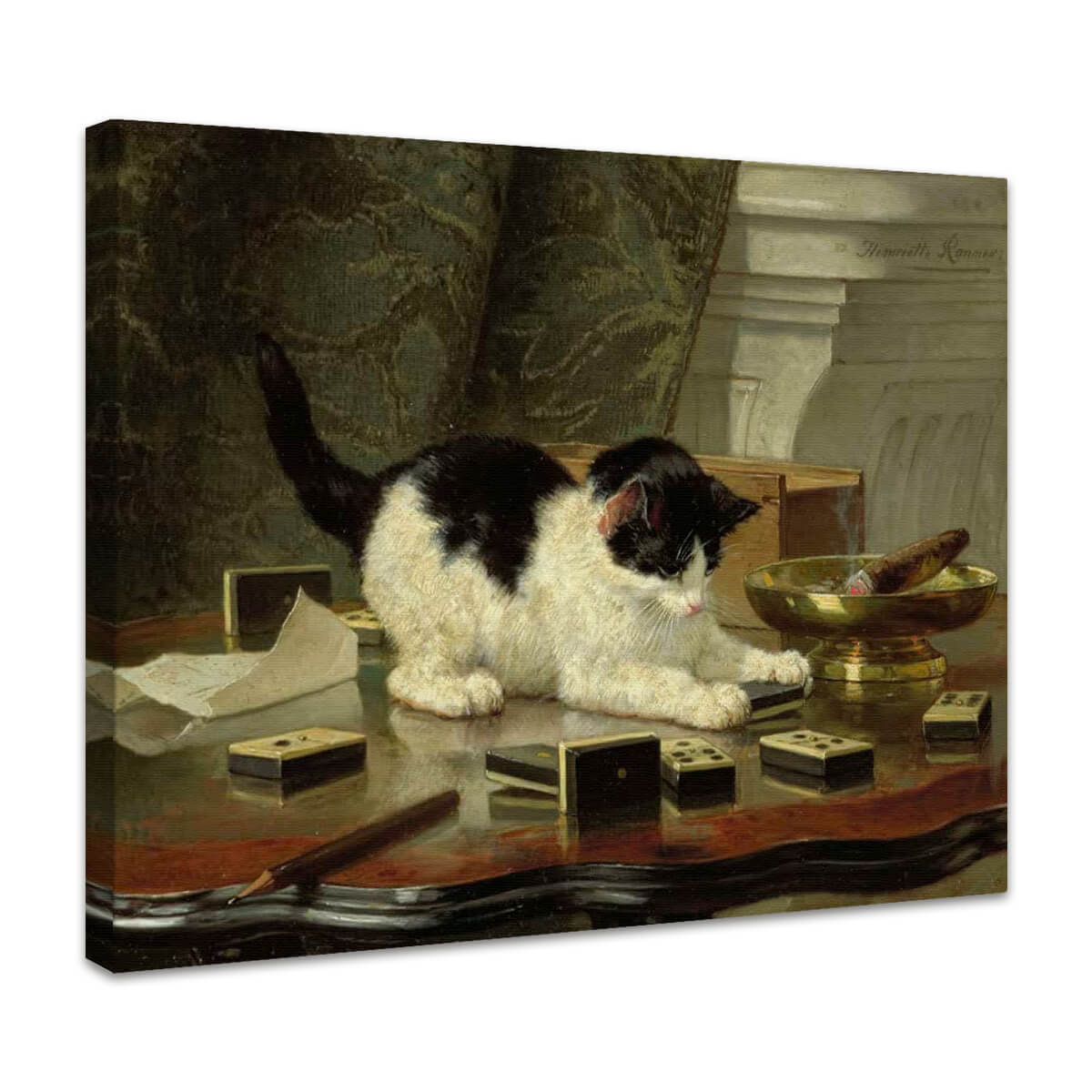 "Die Katze beim Spielen" von Henriëtte Ronner-Knip zeigt eine verspielte Katze in einem häuslichen Moment. Die feine Textur des Fells, die gespannte Haltung und das warme Licht verleihen dem Bild eine vertraute Intimität. Ronner-Knip gelingt es, das lebhafte Wesen der Katze mit großer Feinfühligkeit einzufangen. Ein Klassiker der Tiermalerei mit zeitlosem Reiz.