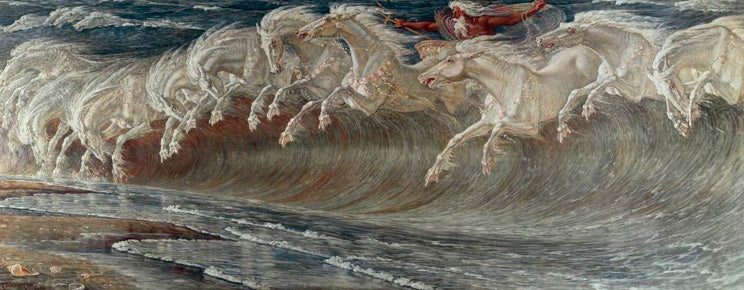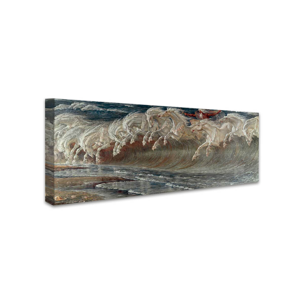 "Die Pferde des Neptun" von Walter Crane ist ein faszinierendes Werk, das den Gott des Meeres, Neptun, mit seinen majestätischen Pferden darstellt. In kräftigen Farben und symbolistischen Details bringt Crane die mythologische Szene zum Leben. Die Darstellung von Neptun, umgeben von den prächtigen, schäumenden Pferden, symbolisiert die Macht und Erhabenheit des Meeresgottes. Die dynamische Komposition und die lebendige Farbpalette machen dieses Gemälde zu einem Meisterwerk der viktorianischen Kunst.