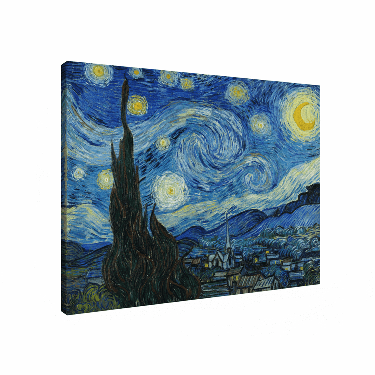 "Die Sternennacht" von Vincent van Gogh ist ein ikonisches Gemälde, das 1889 entstanden ist. Es zeigt eine nächtliche Landschaft mit einem dramatischen Himmel, der von wirbelnden, leuchtenden Sternen und einem großen, strahlenden Mond dominiert wird. Die Farben sind lebhaft und intensiv, mit tiefen Blautönen und leuchtendem Gelb, die eine fast traumhafte Atmosphäre schaffen.