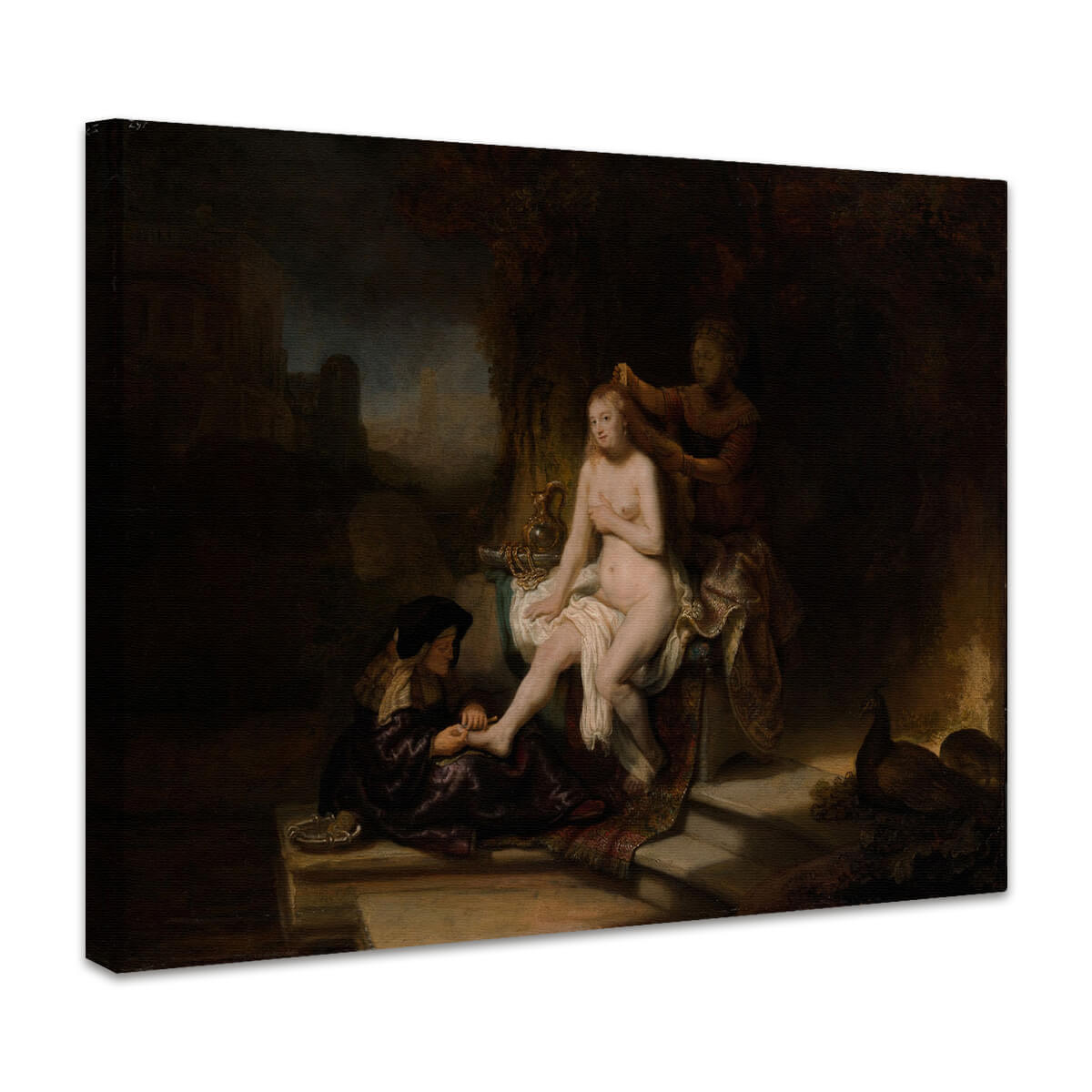 Das Gemälde "Die Toilette der Batseba" von Rembrandt van Rijn ist ein beeindruckendes Meisterwerk der Barockzeit, das mit seiner emotionalen Intensität und kunstvollen Darstellung fasziniert. In Öl auf Leinwand gemalt, zeigt das Werk die biblische Szene der Batseba, die sich für König David vorbereitet.