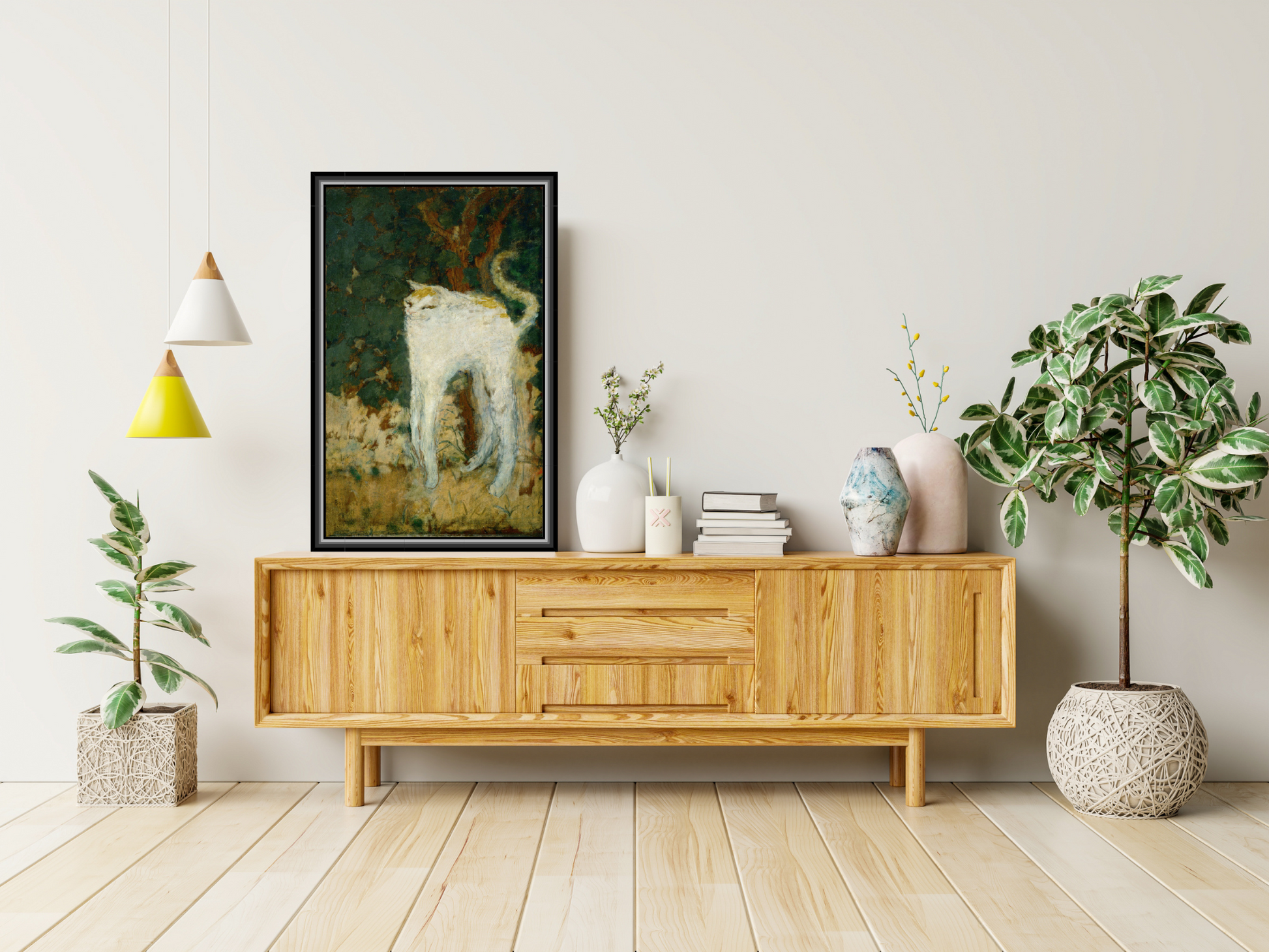 Verleihen Sie Ihrem Zuhause einen Hauch von Impressionismus mit einem hochwertigen Kunstdruck von Pierre Bonnards "Die weiße Katze" aus dem Jahr 1894. Dieses humorvolle Gemälde zeigt eine übertrieben gewölbte weiße Katze mit schlitzartigen Augen und einem listigen Ausdruck. Bonnard nutzt Verzerrung, um die Katze sowohl zahm als auch wild erscheinen zu lassen. Der Kunstdruck wird auf hochwertigem Material gefertigt, das die lebendigen Farben und die Details des Originals bewahrt. Ein Muss für Kunstliebhaber und Sammler bedeutender Werke des Post-Impressionismus.