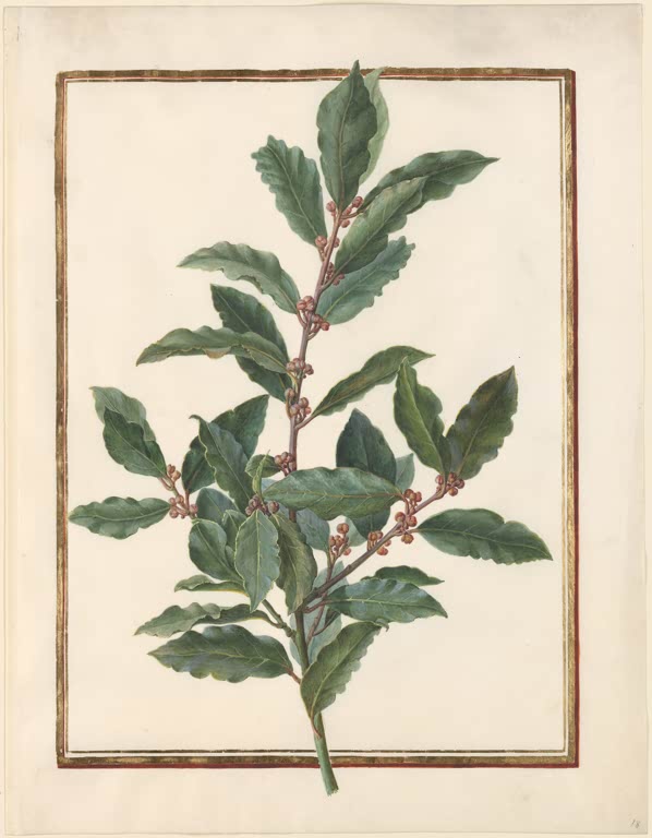 In dieser fein ausgearbeiteten botanischen Darstellung zeigt Madeleine Françoise Basseporte den "Echten Lorbeer (Laurus nobilis)" mit beeindruckender Präzision und künstlerischer Zurückhaltung. Die sattgrünen, glänzenden Blätter und die dezent hervorgehobenen Blütenknospen sind nicht nur wissenschaftlich exakt wiedergegeben, sondern auch mit einem feinen ästhetischen Gespür arrangiert.