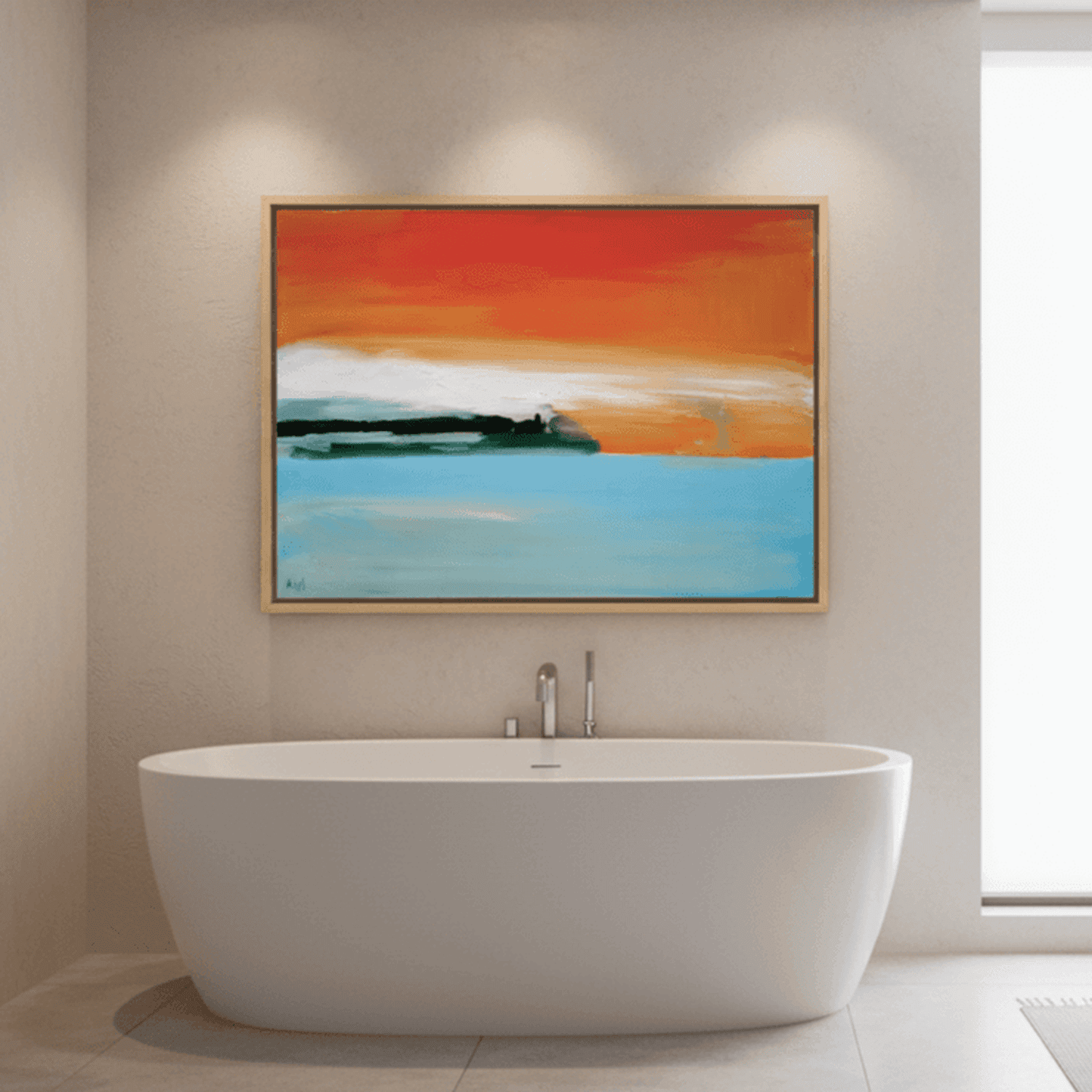 Unsere Schattenfugenrahmen werden passgenau um das auf Keilrahmen gespannte Gemälde montiert. Der umlaufende Abstand von etwa 1 cm erzeugt eine elegante Schattenfuge, die dem Kunstwerk zusätzliche optische Tiefe verleiht.