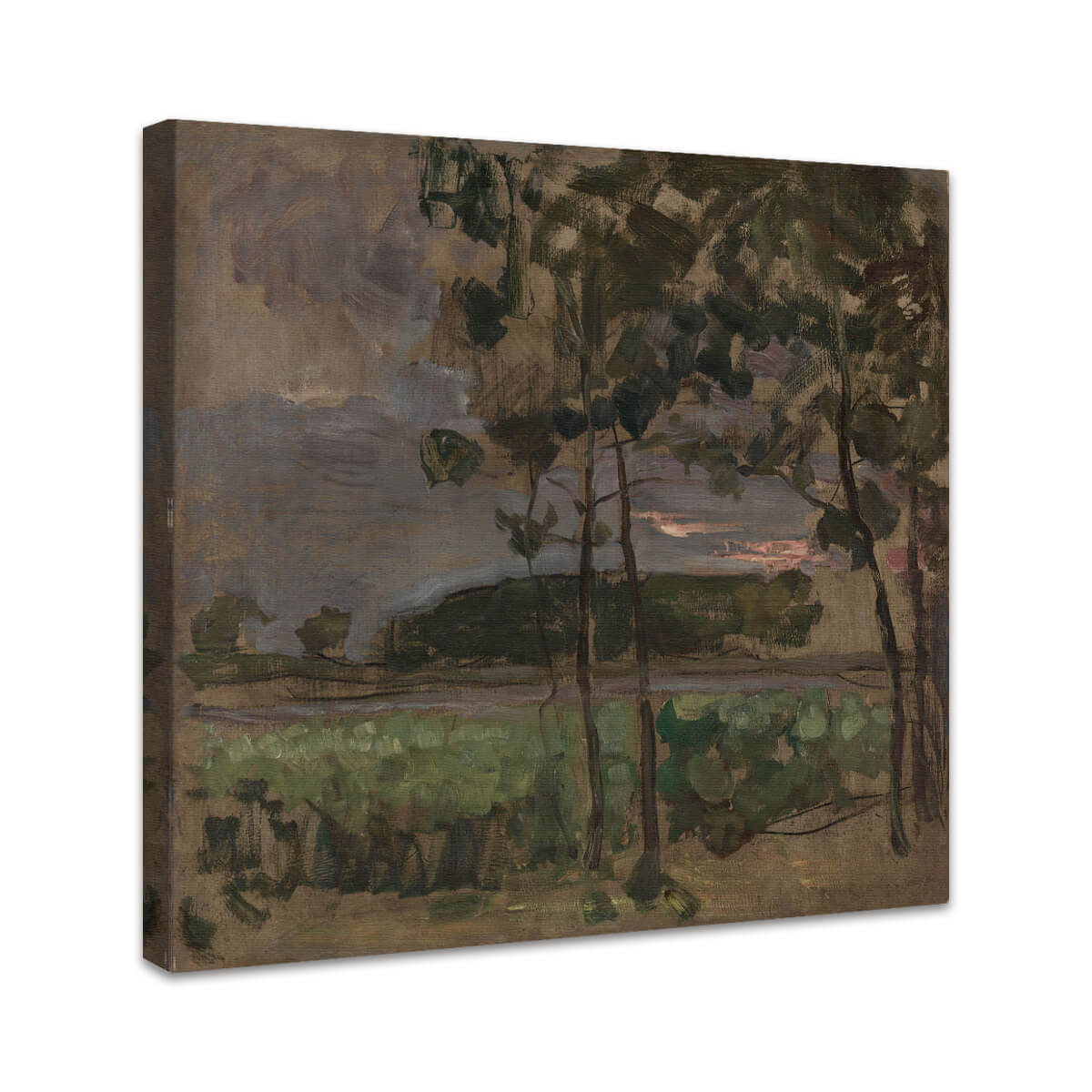 "Feld mit jungen Bäumen im Vordergrund“ ist ein frühes Werk von Piet Mondrian, das die Übergangsphase zwischen seinem figurativen Stil und der späteren Abstraktion eindrucksvoll verdeutlicht. Das Gemälde zeigt eine Landschaft mit jungen Bäumen, deren filigrane Formen und reduzierte Farbgebung bereits Mondrians Suche nach formaler Klarheit und struktureller Harmonie erkennen lassen. Die Bäume und Felder sind in geometrisch angedeuteten Flächen komponiert, während die sanften Erdtöne und das gedämpfte Licht eine ruhige, meditative Atmosphäre schaffen. Dieses Werk markiert Mondrians allmähliche Abkehr vom traditionellen Landschaftsbild hin zu seiner ikonischen, abstrakten Bildsprache.