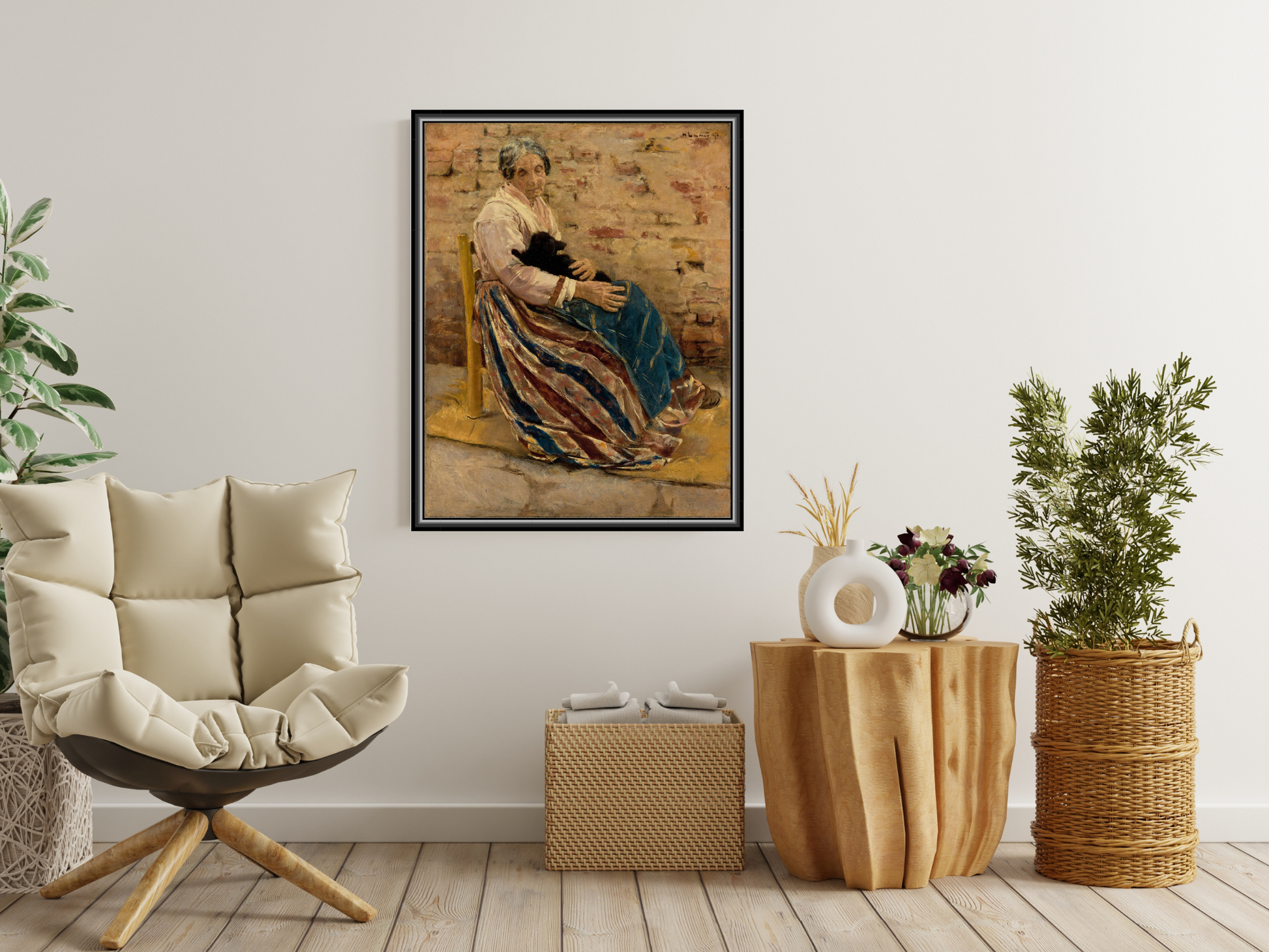 Liebermann, einer der bedeutendsten Vertreter des deutschen Impressionismus, setzt hier auf lockere, lebendige Pinselstriche und ein fein abgestimmtes Farbspiel aus warmen Erdtönen, sanften Beigetönen und dezenten Kontrasten. Das Licht fällt weich auf die Figuren und hebt die innige Verbindung zwischen Frau und Katze hervor.