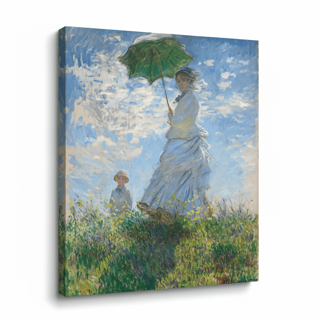 Claude Monets "Frau mit Sonnenschirm – Madame Monet und ihr Sohn“, entstanden im Jahr 1875, ist ein Meisterwerk des Impressionismus – voller Leichtigkeit, Bewegung und liebevoller Beobachtung. Das Gemälde zeigt Monets Ehefrau Camille und ihren gemeinsamen Sohn Jean bei einem Spaziergang an einem sonnigen Tag, eingefangen in einem flüchtigen, natürlichen Moment.