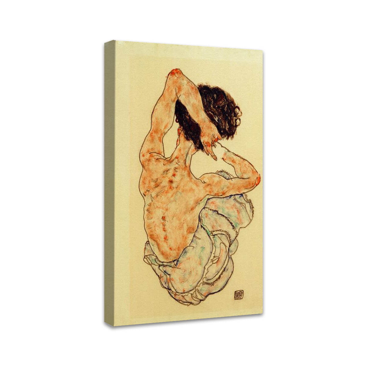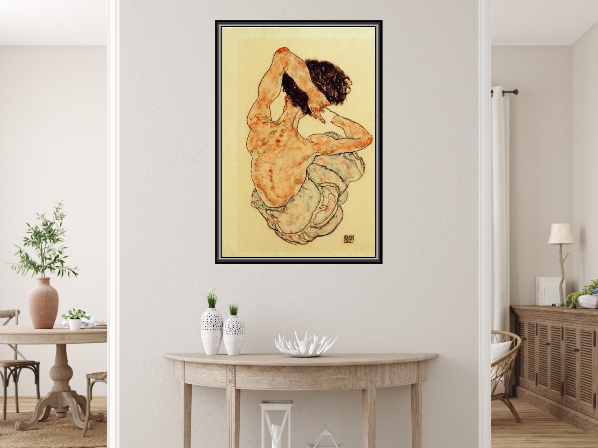 Egon Schieles "Frauenakt von hinten gesehen" besticht durch seine radikale Körperlichkeit und psychologische Tiefe. Die nackte weibliche Figur wird in typischer Schiele-Manier kantig, roh und direkt dargestellt – ein ehrlicher Blick auf Verletzlichkeit und Sinnlichkeit. Die Reproduktion bringt die expressive Strichführung und emotionale Spannung des Originals eindrucksvoll zur Geltung.