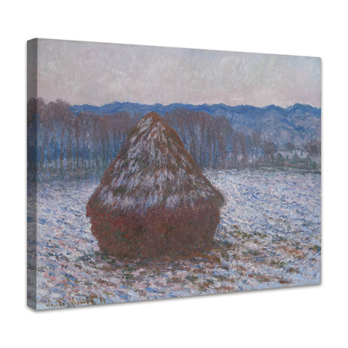 Monet malte diese Serie in seinem Heimatort Giverny, inspiriert von der ländlichen Umgebung und der schlichten Schönheit der Natur. Er studierte die Wirkung von Licht und Wetter auf die Formen und Farben des Heuhaufens und schuf so eine Vielzahl von Werken, die das Spiel von Sonne, Schatten und Jahreszeiten einfangen. "Getreideschober" zeigt den Winter in seiner stillen Eleganz – die kühlen Blau- und Lilatöne des Schnees kontrastieren harmonisch mit den warmen Erdtönen des Heuhaufens, während ein nebliger Himmel die Komposition abrundet. Dieses Bild strahlt Ruhe, Zeitlosigkeit und die Vergänglichkeit des Augenblicks aus.