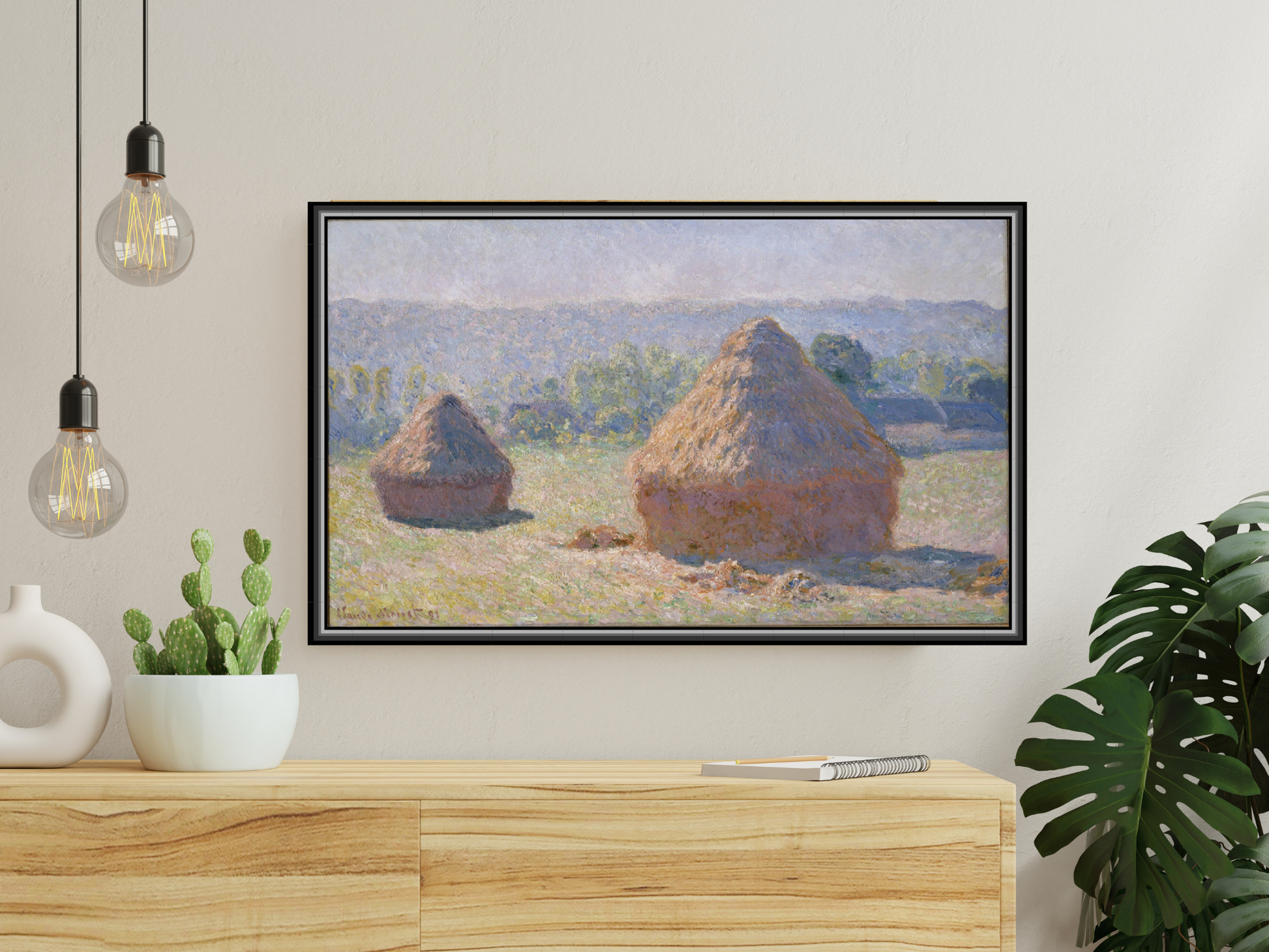 Bereichern Sie Ihre Umgebung mit "Heuschober, Ende des Sommers“ von Claude Monet – ein Meisterwerk, das den Zauber des Spätsommers und die Schönheit der ländlichen Landschaft in Ihr Zuhause bringt.