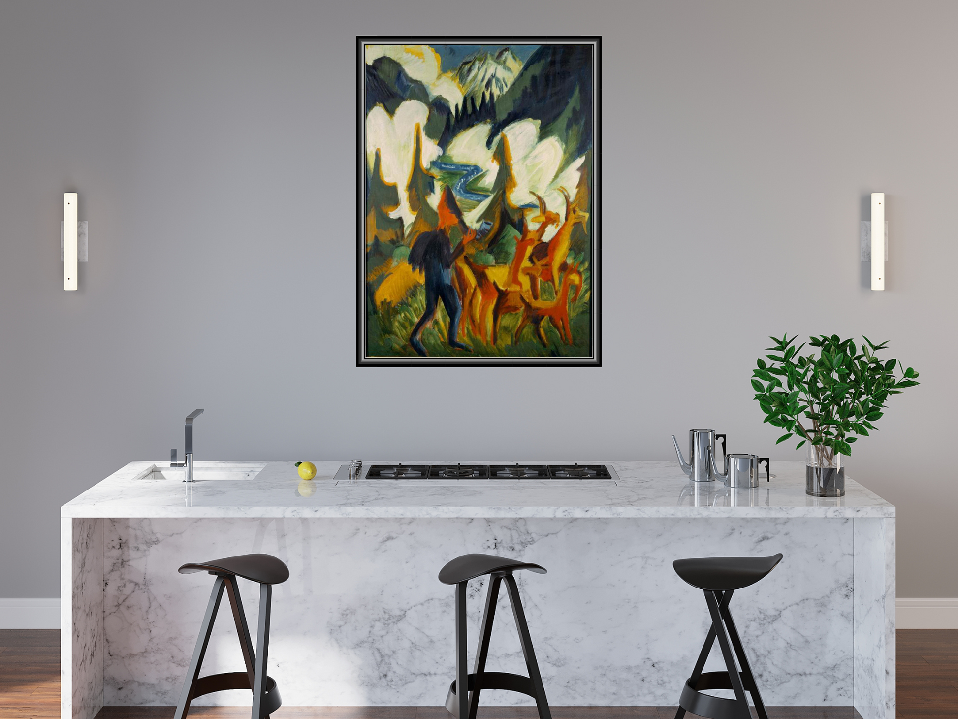 In "Hirte mit Ziegen am Morgen" fängt Ernst Ludwig Kirchner einen Moment ländlicher Ruhe inmitten der Davoser Bergwelt ein. Ein Hirte führt seine Tiere durch eine abstrahierte Landschaft, die in kräftigen Farben und expressiven Formen leuchtet. Das Bild zeigt Kirchners späte Schaffensphase, in der er sich zurückgezogen in den Schweizer Alpen mit der Natur, dem einfachen Leben und innerer Einkehr beschäftigte.