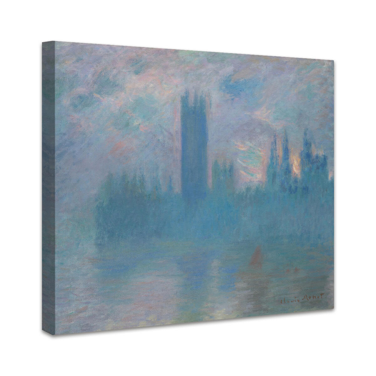 Dieses faszinierende Gemälde von Claude Monet, einem der bekanntesten Vertreter des Impressionismus, zeigt die berühmten "Houses of Parliament" in London, eingefangen in einer einzigartigen Lichtsituation während der Dämmerung. Das Werk wurde zwischen 1900 und 1901 gemalt und ist Teil einer Reihe von Bildern, die Monet von seinem Hotelzimmer aus, mit Blick auf die Themse und das Parlament, schuf. Es vermittelt eine fast mystische Atmosphäre, in der das flimmernde Licht des Sonnenuntergangs das Gebäude und den Fluss in sanfte Farben taucht.