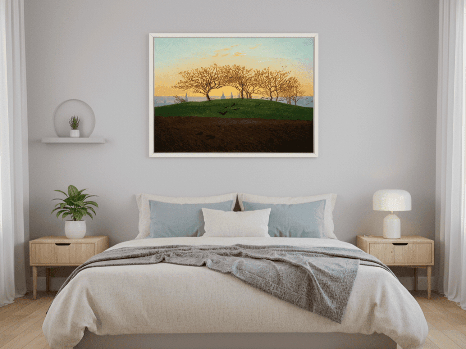 Unsere Schattenfugenrahmen werden passgenau um das auf Keilrahmen gespannte Gemälde montiert. Der umlaufende Abstand von etwa 1 cm erzeugt eine elegante Schattenfuge, die dem Kunstwerk zusätzliche optische Tiefe verleiht.