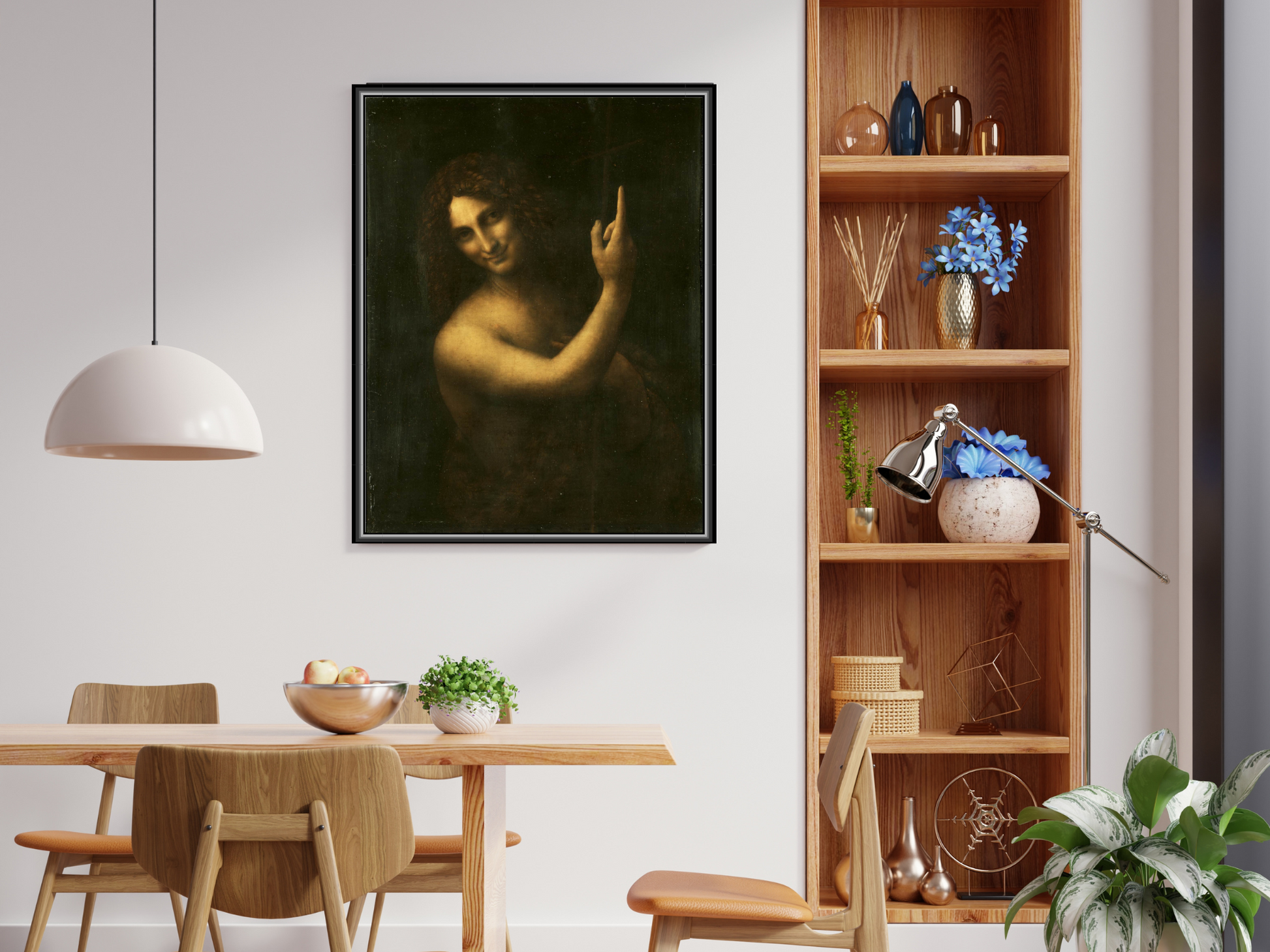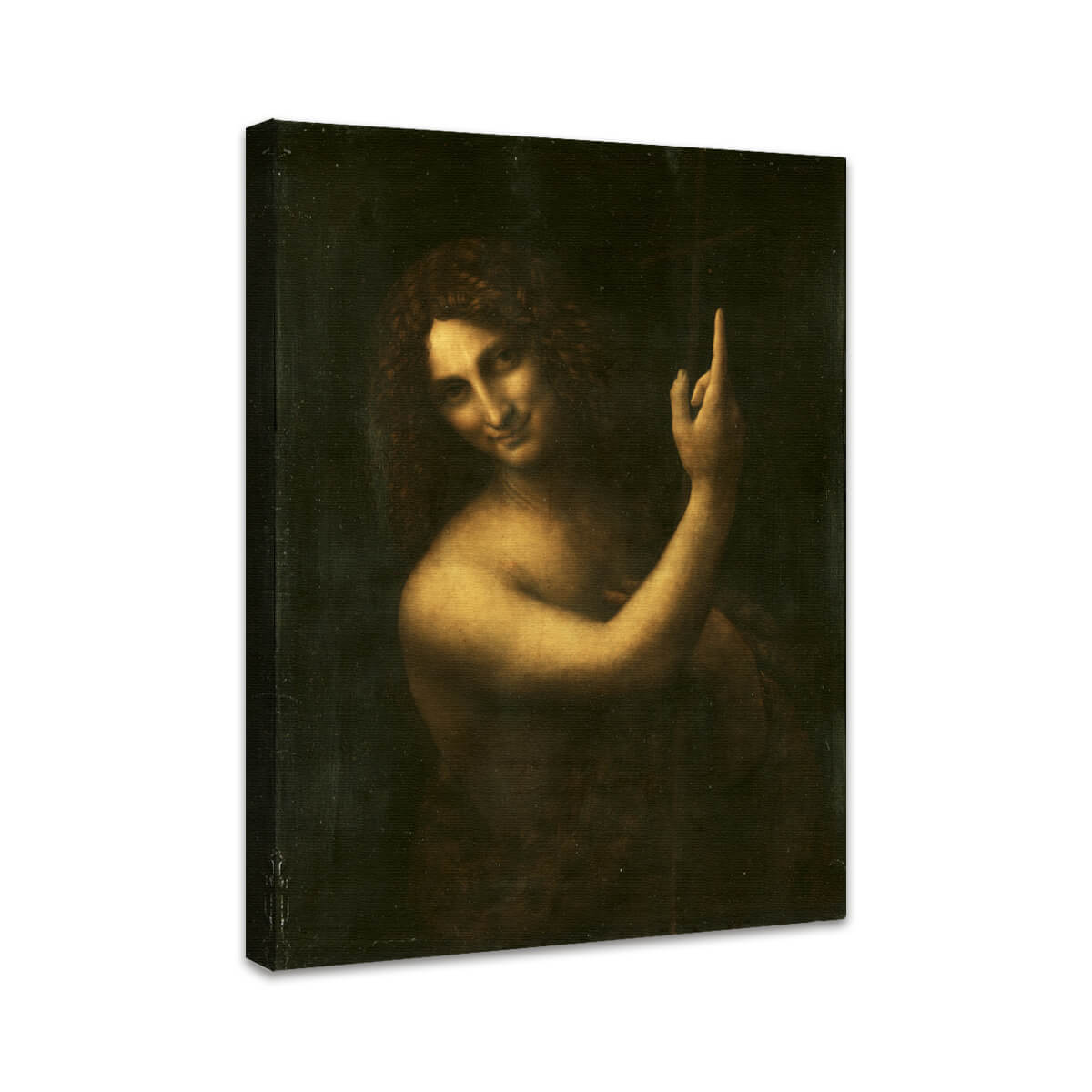 Leonardo da Vincis "Johannes der Täufer“ zeigt den Heiligen in geheimnisvoller Dunkelheit mit einem sanften Lächeln und erhobenem Zeigefinger. Das Gemälde beeindruckt durch seine subtile Lichtführung, die weiche Modellierung des Körpers und die spirituelle Tiefe des Ausdrucks. Diese hochwertige Kunstreproduktion bringt die meisterhafte Technik und das geheimnisvolle Charisma Leonardos in jeden Raum.