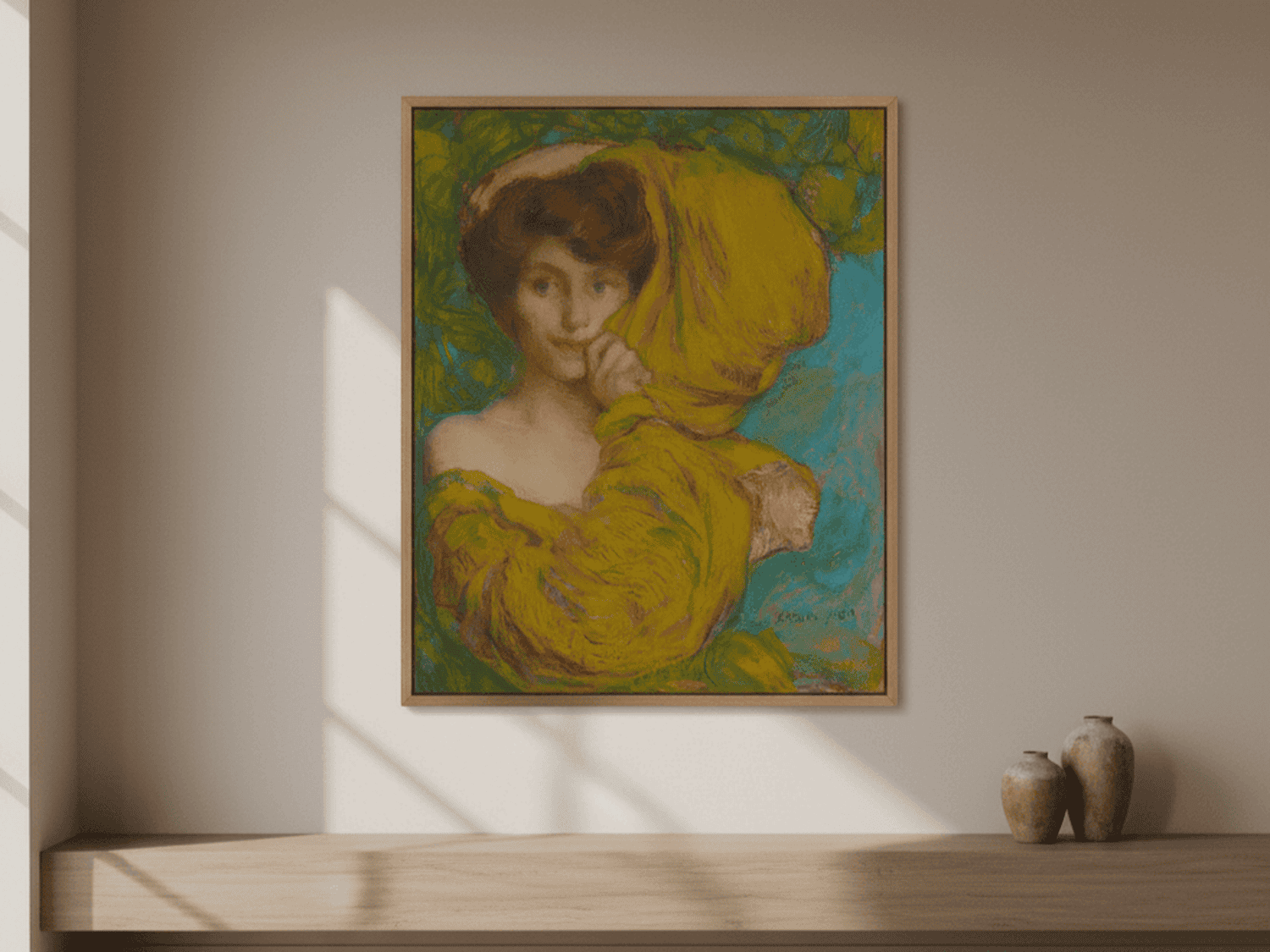 Das Porträt zeigt eine junge Frau, die einen leuchtend gelben Schal trägt, der sofort den Blick des Betrachters auf sich zieht. Edmond Aman-Jean fängt die zarte Schönheit und den Ausdruck der Figur mit sanften, fließenden Pinselstrichen ein. Die Gesichtszüge sind ruhig und harmonisch, während der Schal durch seine intensive Farbe für Dynamik und Wärme sorgt. Der Hintergrund ist zurückhaltend gehalten, um die Aufmerksamkeit auf die Gestalt und die feinen Details des Porträts zu lenken. Die Stimmung ist zugleich nachdenklich und elegant, typisch für Aman-Jeans symbolistischen Ansatz.