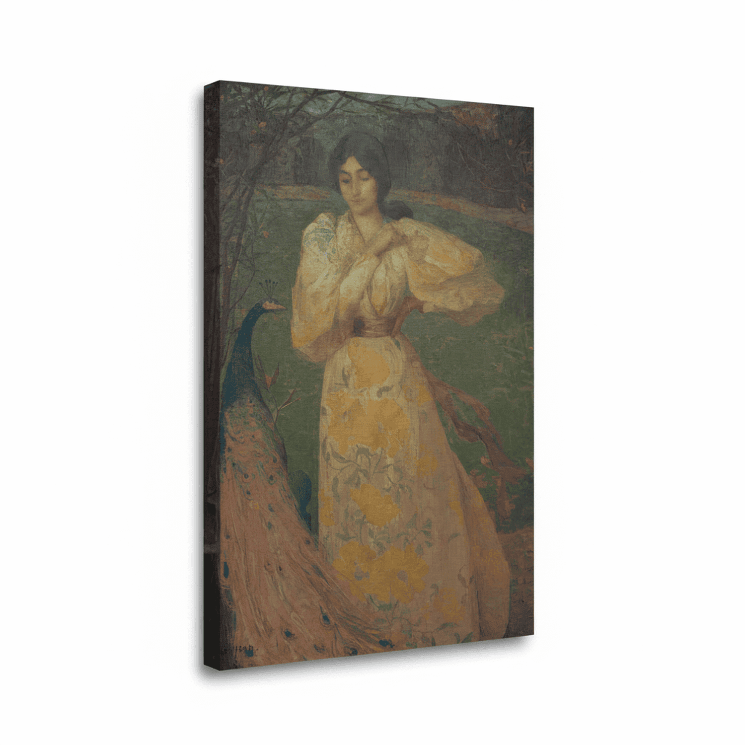 Das Gemälde zeigt ein junges Mädchen in stiller, anmutiger Haltung, begleitet von einem Pfau mit prachtvollem Gefieder. Edmond Aman-Jean verbindet die menschliche Figur und das Tier zu einer harmonischen, symbolischen Einheit. Das Mädchen wirkt ruhig und in sich gekehrt, während der Pfau mit seinen schillernden Farben einen dekorativen und zugleich bedeutungsvollen Akzent setzt. Die weiche Linienführung, die gedämpfte Farbpalette und der reduzierte Hintergrund verleihen dem Werk eine träumerische, zeitlose Atmosphäre. Das Bild steht exemplarisch für Aman-Jeans symbolistische Bildsprache, in der Schönheit, Stille und Bedeutung subtil miteinander verschmelzen.
