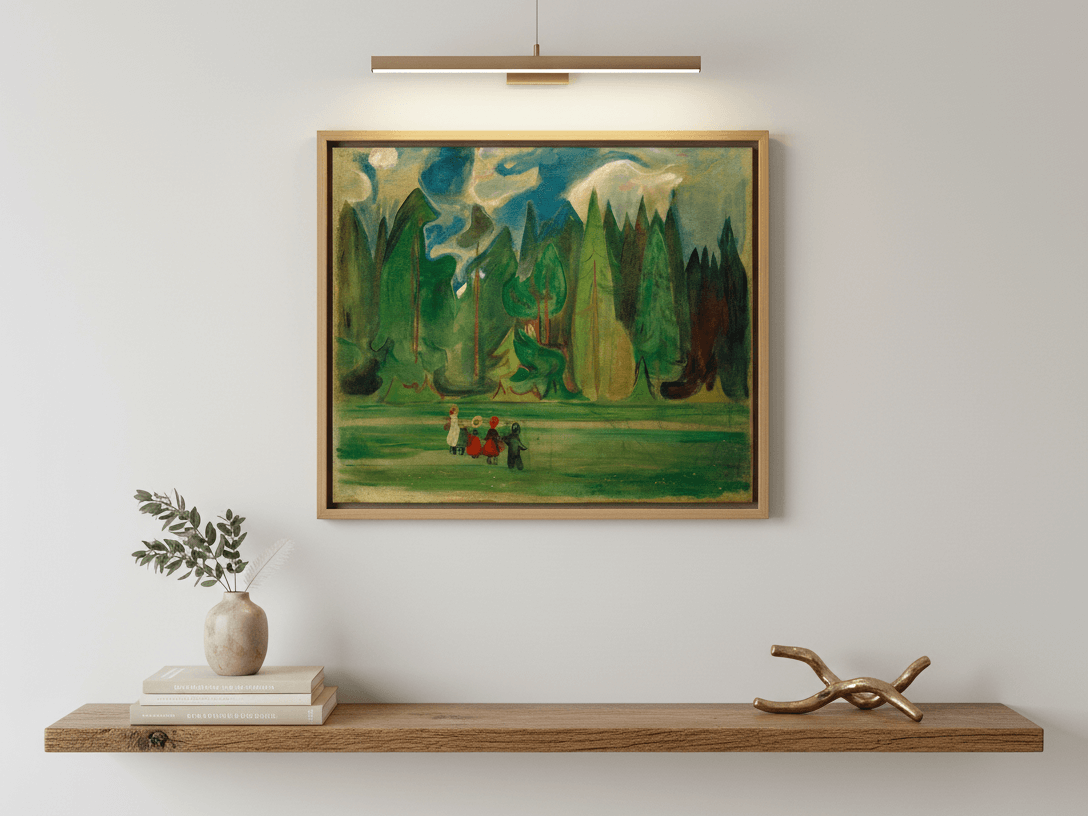 "Kinder im Wald“ zeigt – wie der Titel andeutet – Kinder in einer Waldlandschaft. Munchs Waldbilder sind oft mehr als einfache Naturdarstellungen: Der Wald wird zum Symbolraum, zur Bühne für Emotionen, Kindheit, Unschuld und vielleicht auch ein wenig Geheimnis. Die Kombination aus Farben, Formen und kompositorischer Dichte erzeugt eine verträumte, fast märchenhafte Atmosphäre — ein eindrucksvoller Ausdruck Munchs symbolistischer Sicht auf Natur und Seele.