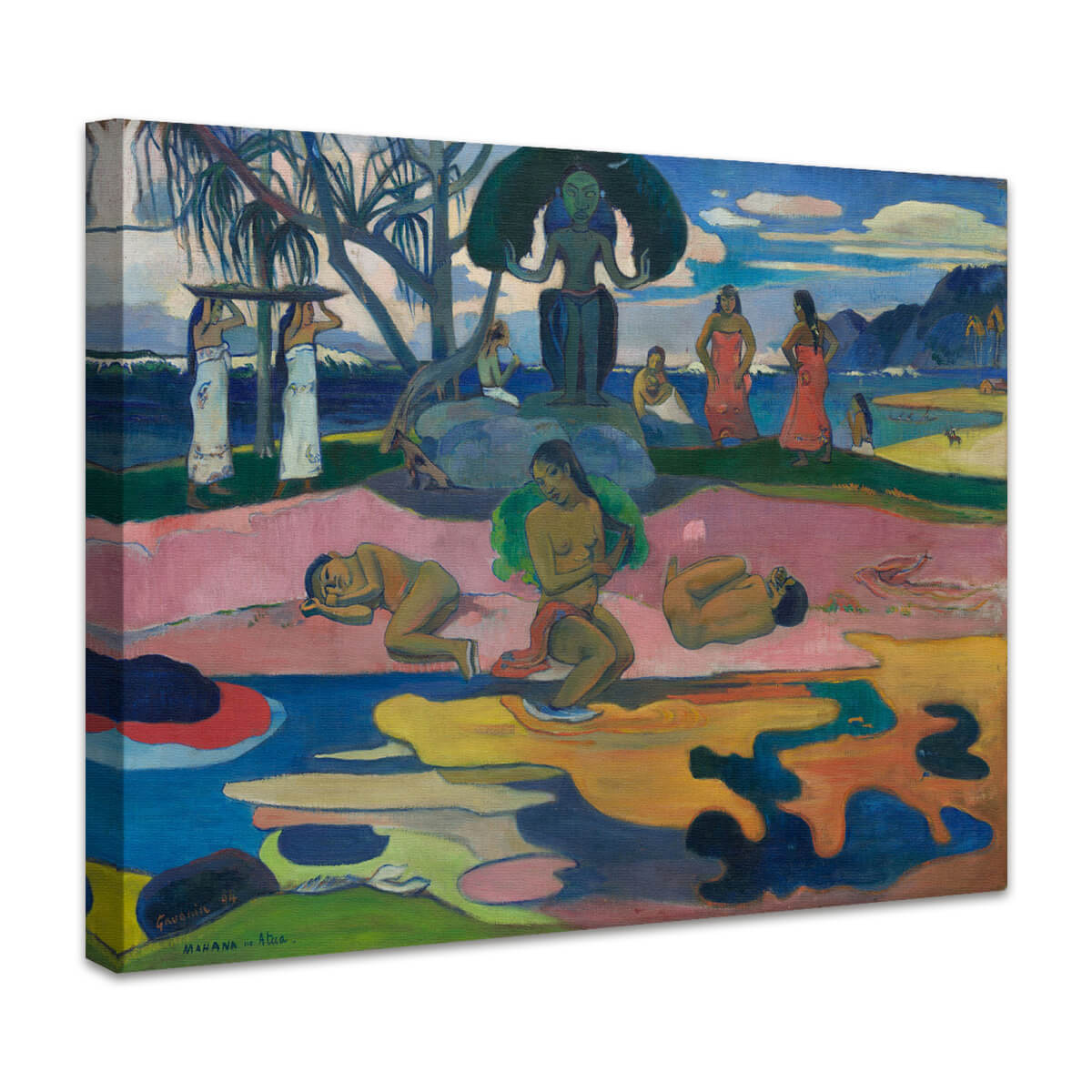 "Mahana no atua" (übersetzt "Tag des Gottes") von Paul Gauguin ist ein ikonisches Werk der Kunstgeschichte und ein Meisterwerk des Symbolismus. Dieses 1894 entstandene Gemälde gehört zu Gauguins berühmter Tahiti-Periode und spiegelt seine Faszination für die spirituelle und kulturelle Welt der Südsee wider. Es vereint leuchtende Farben, vereinfachte Formen und eine tiefgründige Symbolik, die den Betrachter in eine mystische und traumhafte Atmosphäre eintauchen lässt.