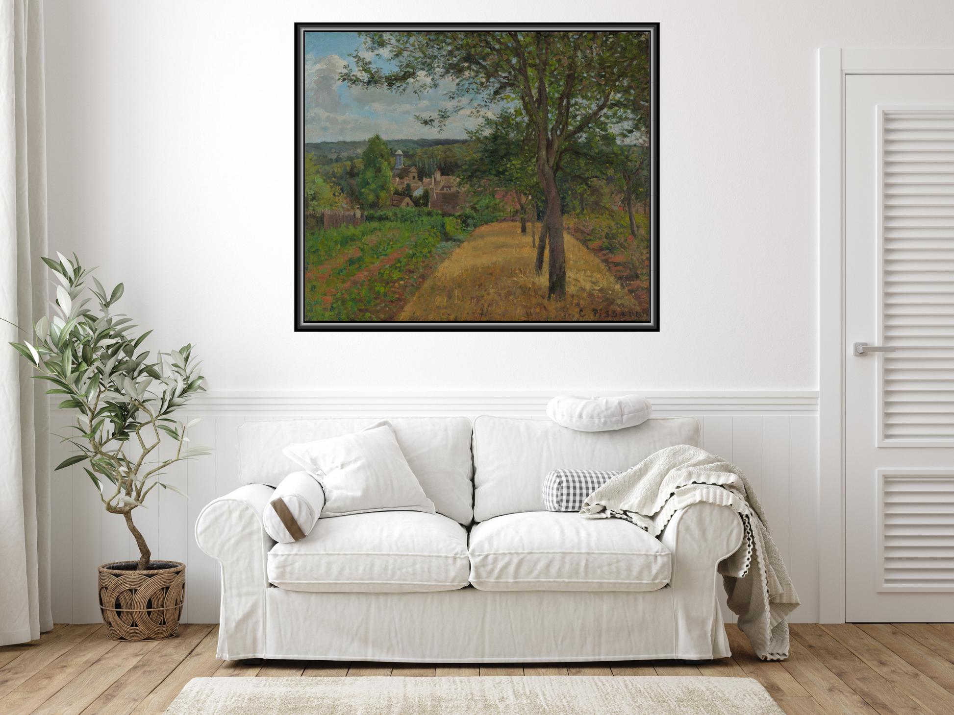 Bringen Sie mit dem Kunstdruck "Obstgärten in Louveciennes" von Camille Pissarro die Leichtigkeit und Schönheit des französischen Landlebens in Ihre Räume – zeitlos, beruhigend und voller Charme.