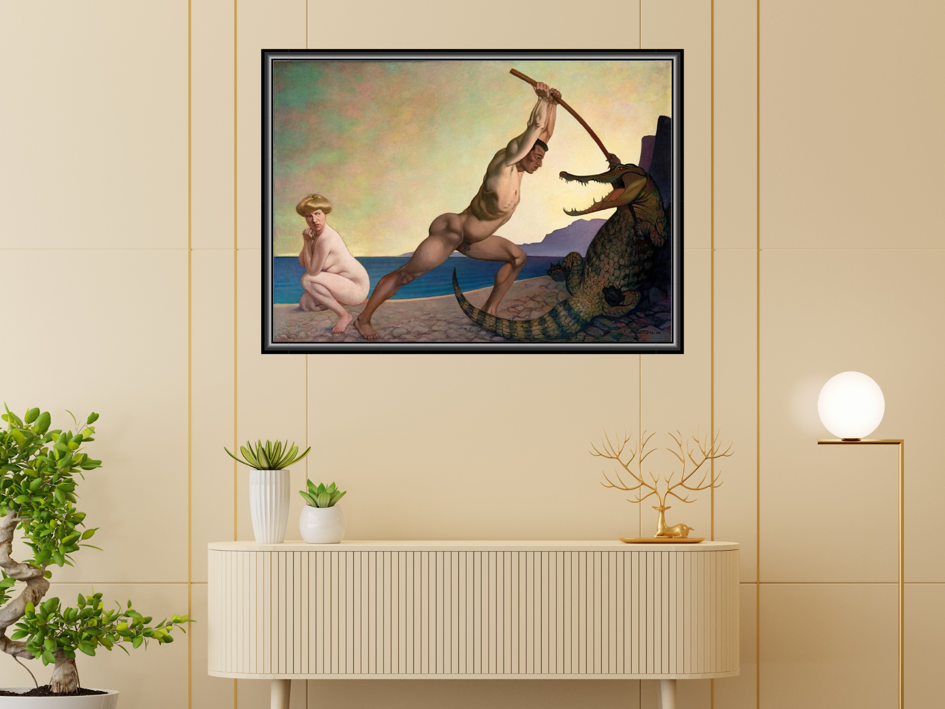 "Perseus tötet den Drachen" ist ein beeindruckendes Ölgemälde des Schweizer Künstlers Félix Vallotton aus dem Jahr 1910. Das Werk, das im Musée d'Art et d'Histoire in Genf ausgestellt ist, zeigt eine Szene aus der griechischen Mythologie, in der der Held Perseus die Prinzessin Andromeda vor einem Drachen rettet. Vallottons charakteristischer Stil kombiniert klare Linien mit kräftigen Farben, was dem Gemälde eine intensive Ausdruckskraft verleiht.