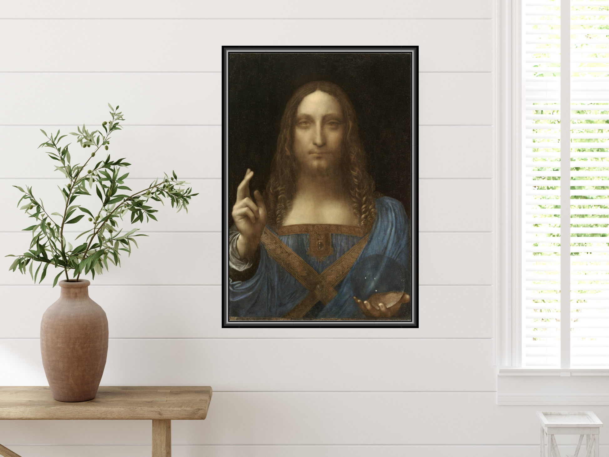 Leonardos meisterhafte Sfumato-Technik, die subtilen Lichtverläufe und die kontemplative Ausstrahlung der Figur machen Salvator Mundi zu einem Werk von spiritueller Tiefe und technischer Perfektion. Der Blick Christi ist ruhig und durchdringend zugleich – eine Darstellung von Würde, Stille und transzendenter Präsenz.