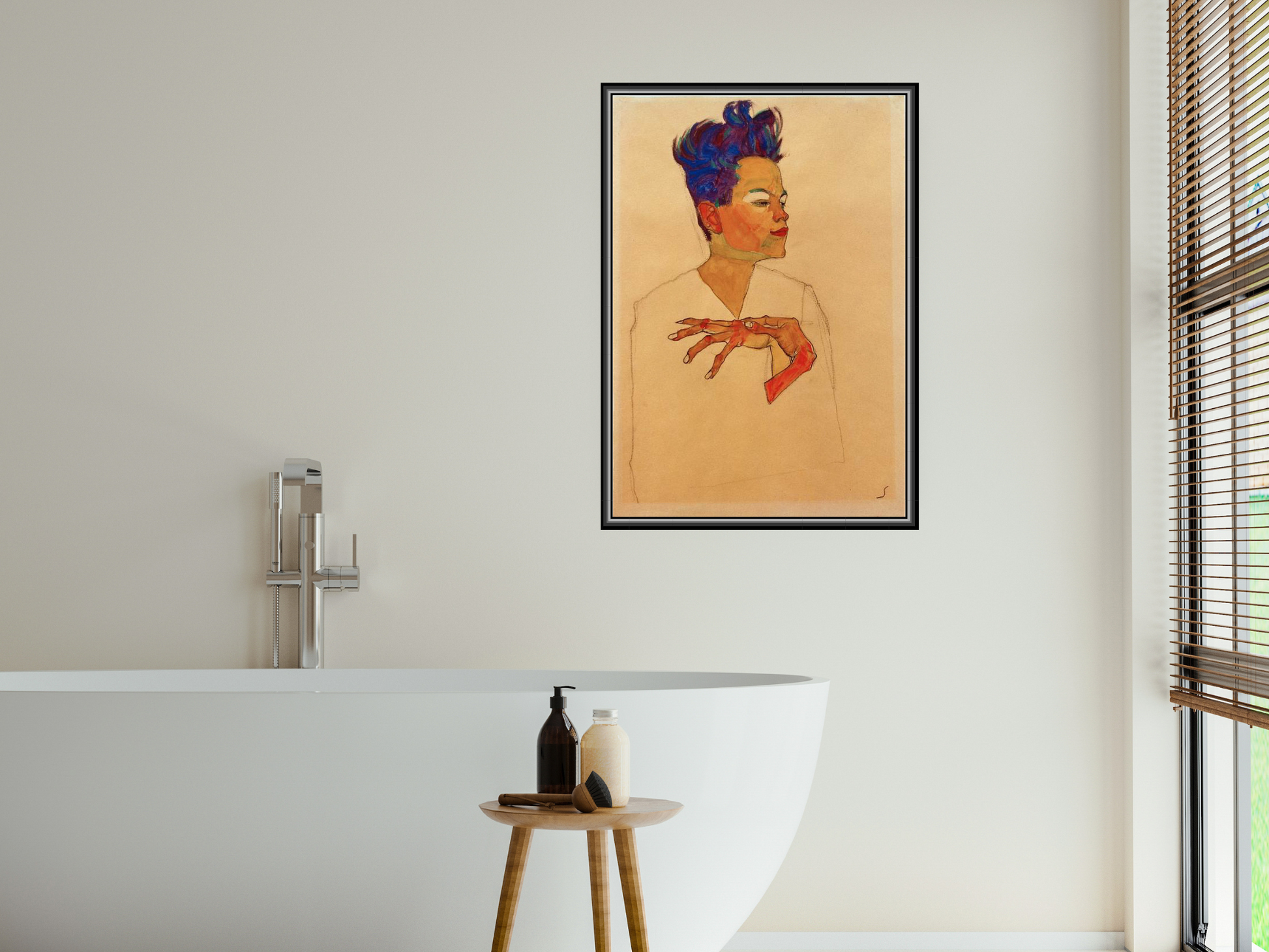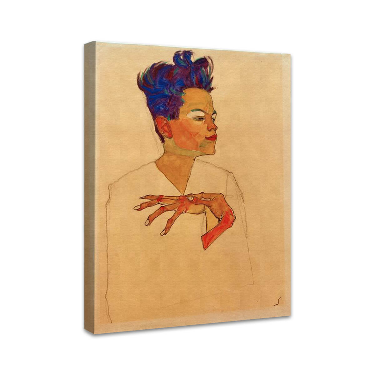 Egon Schieles "Selbstporträt mit an die Brust gelegten Händen" offenbart eindrucksvoll die emotionale Tiefe und expressive Körperlichkeit des Künstlers. Mit kantigen Linien und intensivem Blick vermittelt Schiele eine verletzliche, gleichzeitig selbstbewusste Darstellung seiner selbst. Diese Kunstreproduktion bringt die unverwechselbare Ausdruckskraft und psychologische Intensität des Wiener Expressionismus in jede Umgebung.