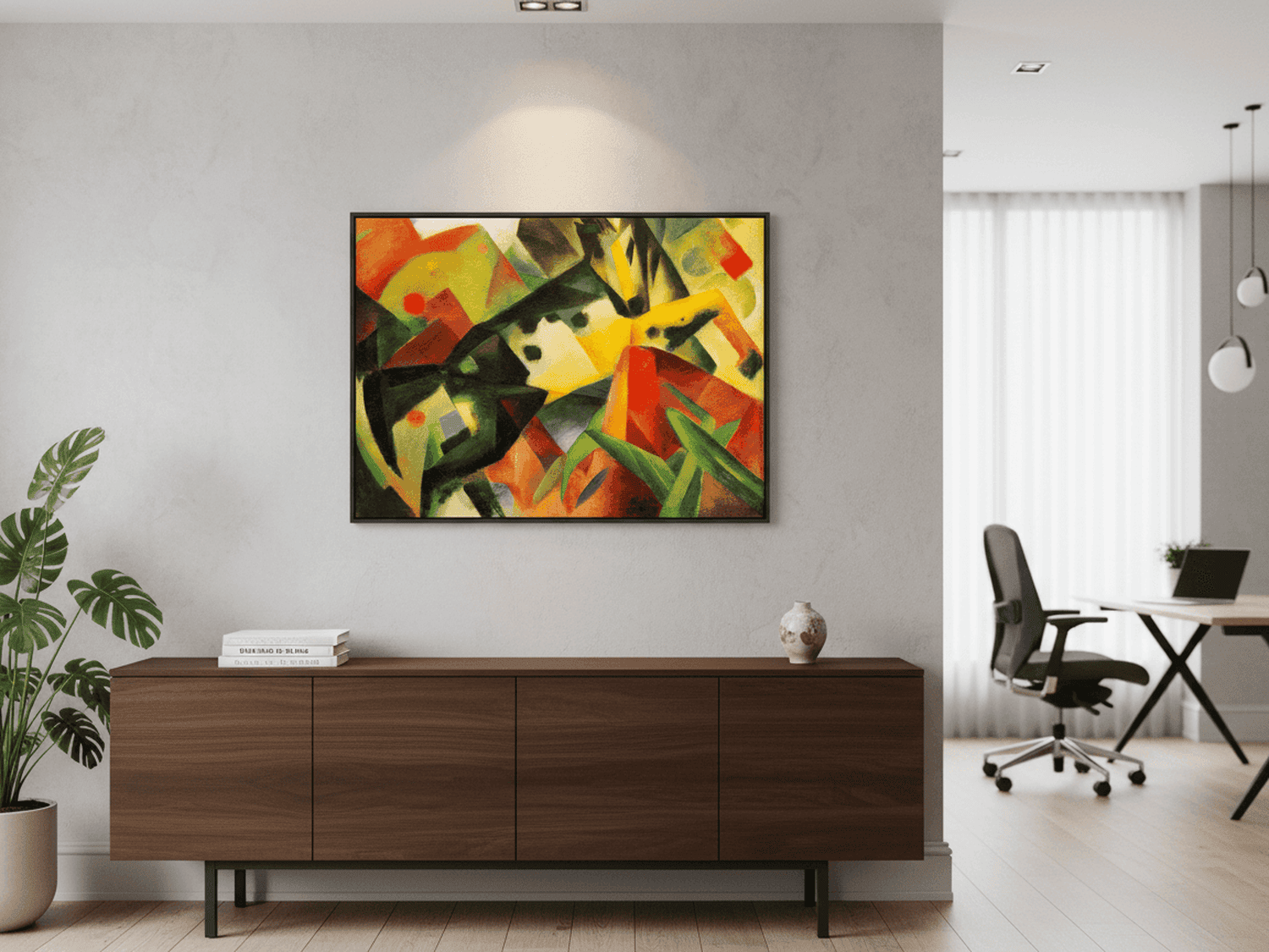 "Springendes Pferd" zeigt die charakteristische Dynamik und Ausdruckskraft, für die Franz Marc bekannt ist. Das stilisierte Pferd erscheint in energiegeladener Bewegung, getragen von intensiven Farben und klaren, rhythmischen Formen. Das Werk spiegelt Marcs künstlerisches Ziel wider, Tiere als reine, harmonische Wesen darzustellen und ihre innere Lebendigkeit sichtbar zu machen. Als hochwertiger Kunstdruck wirkt dieses Motiv modern, kraftvoll und ästhetisch klar strukturiert.