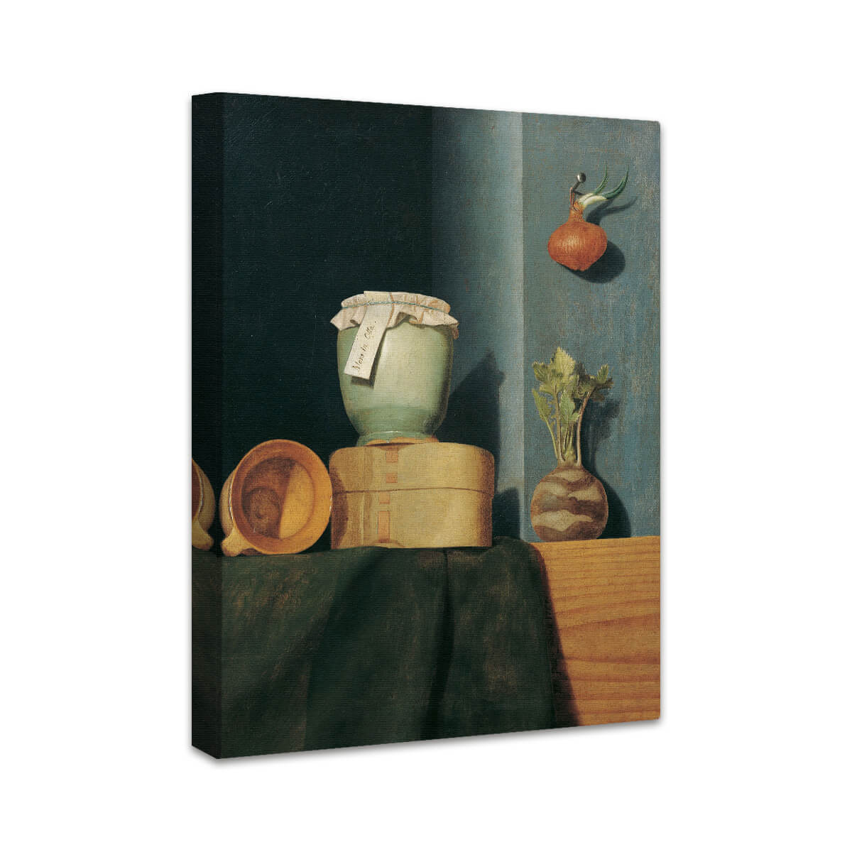Die zarten Licht- und Schatteneffekte verleihen dem Werk eine besondere Tiefe und Lebendigkeit, während die sorgfältige Anordnung von Küchengeschirr und Gemüse eine ruhige und ausgewogene Atmosphäre schafft.