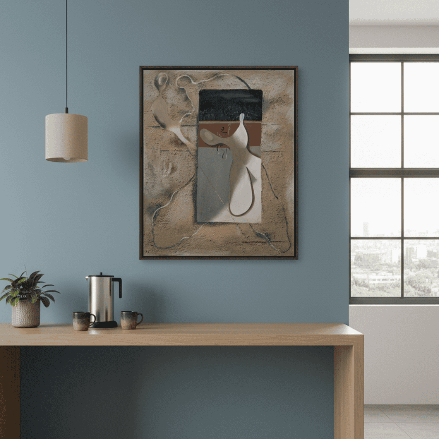 Unsere Schattenfugenrahmen werden passgenau um das auf Keilrahmen gespannte Gemälde montiert. Der umlaufende Abstand von etwa 1 cm erzeugt eine elegante Schattenfuge, die dem Kunstwerk zusätzliche optische Tiefe verleiht.