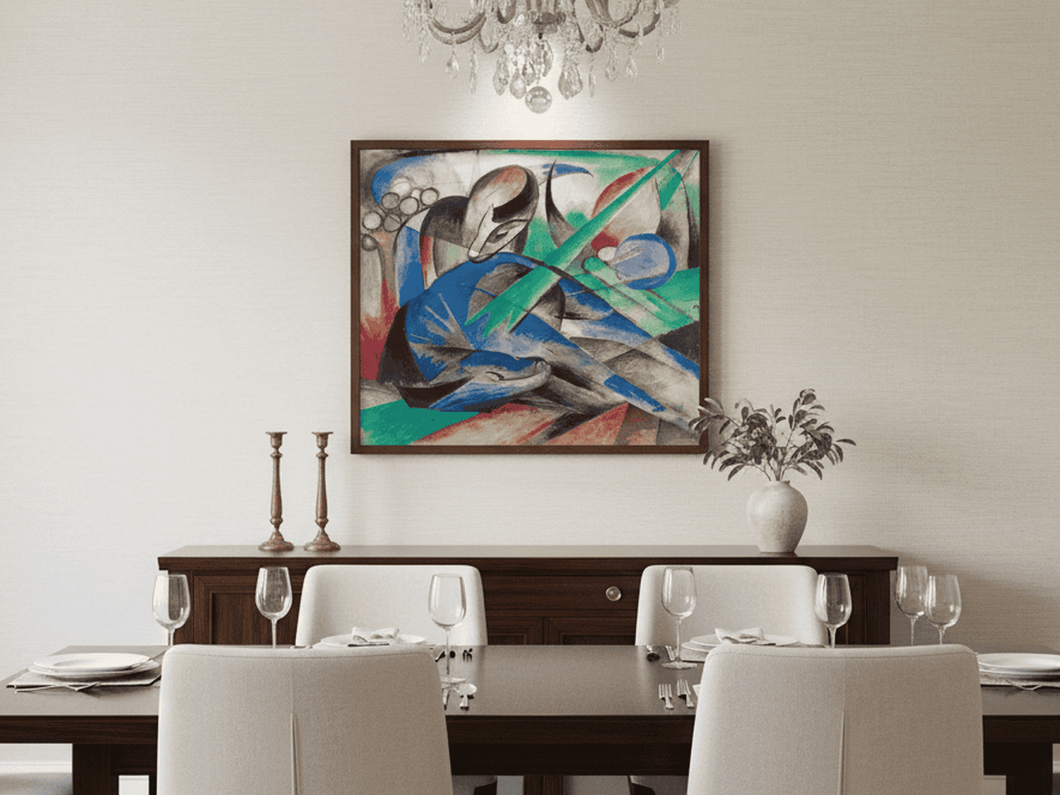 "Träumendes Pferd" zeigt die poetische, kontemplative Seite von Franz Marcs Tierdarstellungen. Das Pferd erscheint in einer ruhigen, fast meditativen Haltung, eingebettet in klare Formen und eine harmonische Farbgebung. Die Komposition vermittelt Ruhe, Innerlichkeit und die für Marc typische spirituelle Verbindung zwischen Tier und Natur. Als hochwertiger Kunstdruck wirkt dieses Motiv sanft, atmosphärisch und zugleich stilistisch modern.