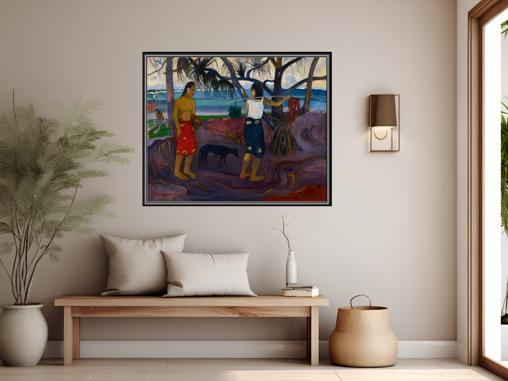 "Unter dem Pandanusbaum" von Paul Gauguin ist ein faszinierendes Gemälde, das die exotische Schönheit der Südsee und das Leben in Tahiti in einem einzigartigen, lebendigen Stil einfängt. Entstanden 1891, zeigt das Werk eine Szene, in der eine junge Frau unter einem üppigen Pandanusbaum sitzt, umgeben von der üppigen Natur der Insel. Gauguin, bekannt für seine Reise in den Pazifik und seine Darstellung von Südsee-Motiven, nutzt kräftige, symbolische Farben und vereinfachte Formen, um die Sinnlichkeit und das mystische Flair des Ortes zu betonen.