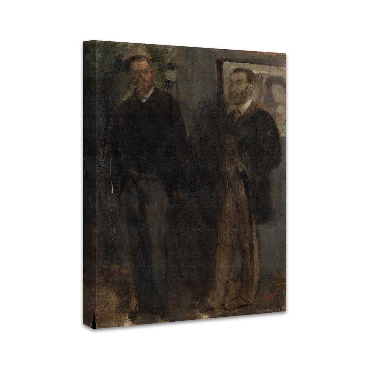 Das Gemälde "Zwei Männer“ von Edgar Degas, entstanden zwischen 1865 und 1869, zeigt eine informelle Szene, möglicherweise in einem Künstleratelier. Degas war dafür bekannt, Personen in ungezwungenen Momenten in ihrer Umgebung darzustellen, um charakteristische Gesten und Haltungen einzufangen, die die Persönlichkeit oder Identität der Dargestellten widerspiegeln.